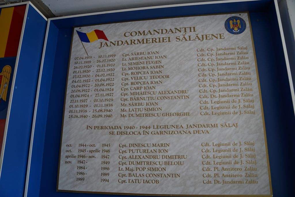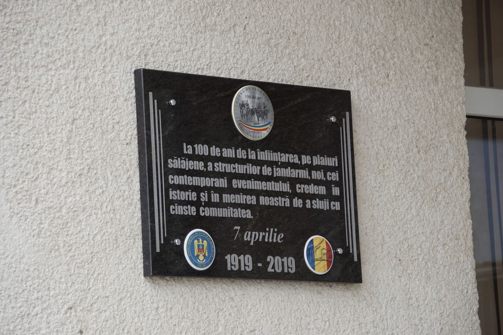 În contextul aniversării a 100 de ani de la înfiinţarea primelor structuri de jandarmerie pe meleaguri sălăjene, la sediul Inspectoratului de Jandarmi Judeţean Sălaj, în cadrul unui ceremonial militar şi religios, a fost dezvelită o placă aniversară: ”La 100 de ani de la înființare, pe plaiuri sălăjene, a structurilor de jandarmi, noi, cei contemporani ai evenimentului, credem în istorie și în menirea noastră de a sluji cu cinste comunitatea.”