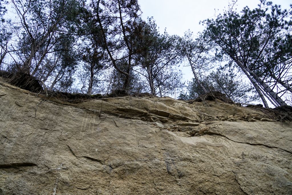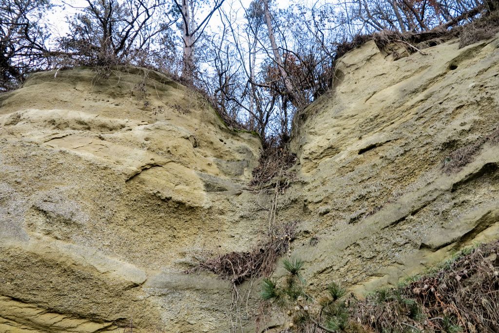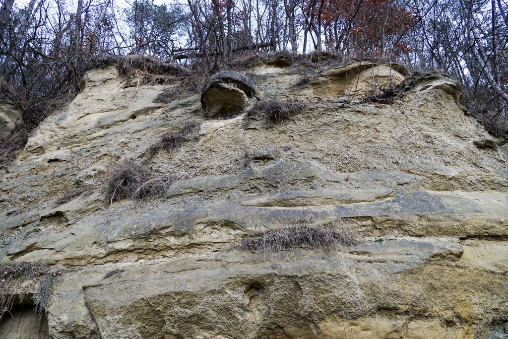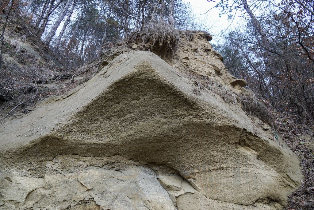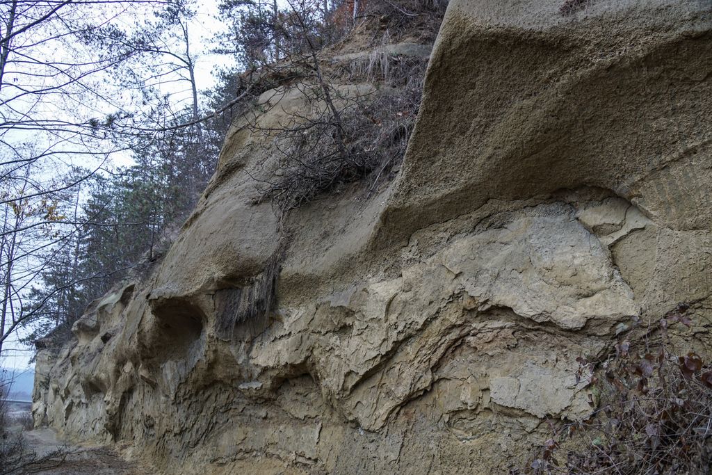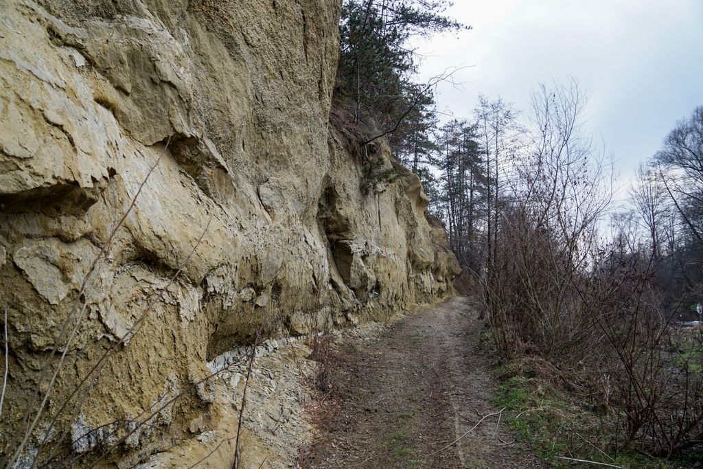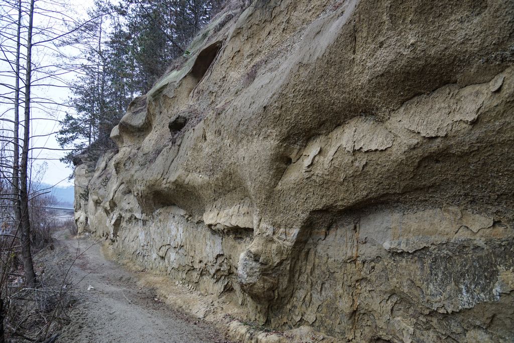 Le-am urmat și noi, în susul văii, și de abia atunci, după ce ne-am întors privirea către peretele de gresie de lângă vale am văzut cât e de frumos, ”sculpturile” galben-învechit luând prim-planul. Se spune că fiecare vede lucrurile prin prisma imaginației proprii. În ceea ce privește formele create de timp în gresiile galben-vechi, prima formațiune, chiar la capăt de zid, pare a ilustra un chip umanoid, e drept, mai ciudat, gura ochii și nasul, ba chiar și părul fiind ”desenate” vizibil. La fel ”dantele” ori forme geometrice împietrite îți dau impresia că tot zidul ăsta e un fel de operă de artă. A naturii ori poate a vreunui uriaș, că povești de genul ăsta sînt o grămadă prin partea asta de lume.
