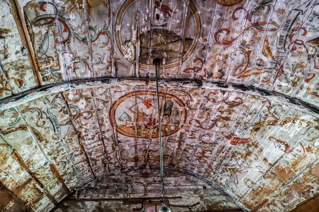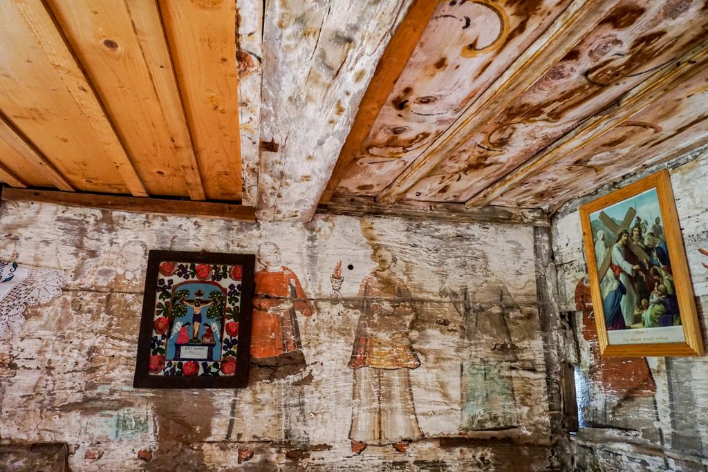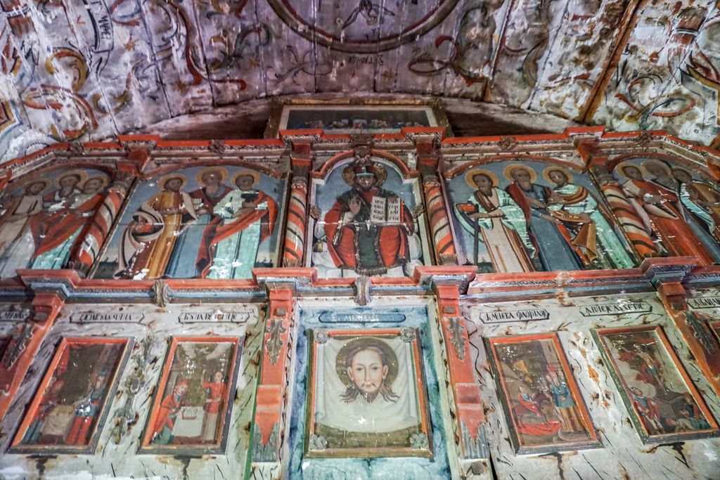 ”Programul iconografic păstrează linia tradițională, în tindă fiind regăsită Pilda Fecioarelor, din această compoziție păstrându-se mai bine grupul celor cinci fecioare înțelepte. Pe peretele de nord și pe cel de răsărit sunt reprezentate sfinte mucenițe precum Sf. Iuliana, Sf. Anastasia, Sf. Maria Magdalena, Sf. Salomia sau Sf. Ioana. Bolta semicilindrică a naosului fost decorată cu câteva medalioane în care sunt prezentate: Sfânta Treime, Mielul ce poartă steagul, Patriarhul Avraam dar și Pilda Pelicanului. În părțile laterale ale bolții naosului au fost redați Evanghelistul Luca, Sf. Proroc Iacov, Evanghelistul Matei, Sf. Proroc Ilie precum și alte scene care, datorită stării de degradare nu pot fi recunoscute. Absida altarului este decorată cu portrete de sfinți părinți: Sf. Spiridon, Sf. Silvestru, Sf. patriarh Alexandru sau Sf. patriarh Macarie. Bolta absidei este decorată cu imaginea porumbelului, simbolul Sf. Duh. Spațiile dintre imagini au fost completate cu decorații vegetale, realizate într-o cromatică dominată de culori vii precum galbenul, roșu sau verdele, specifice canoanelor barocului”, conform Wikipedia.
