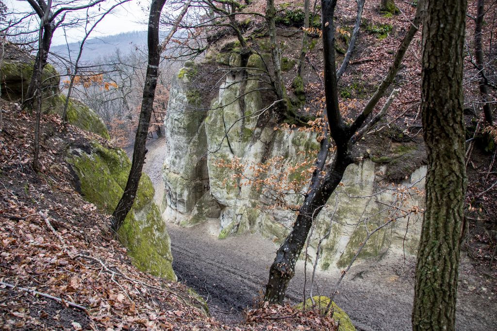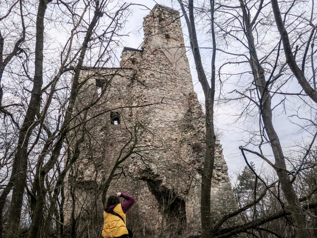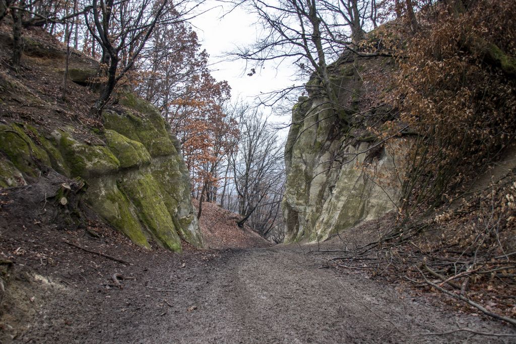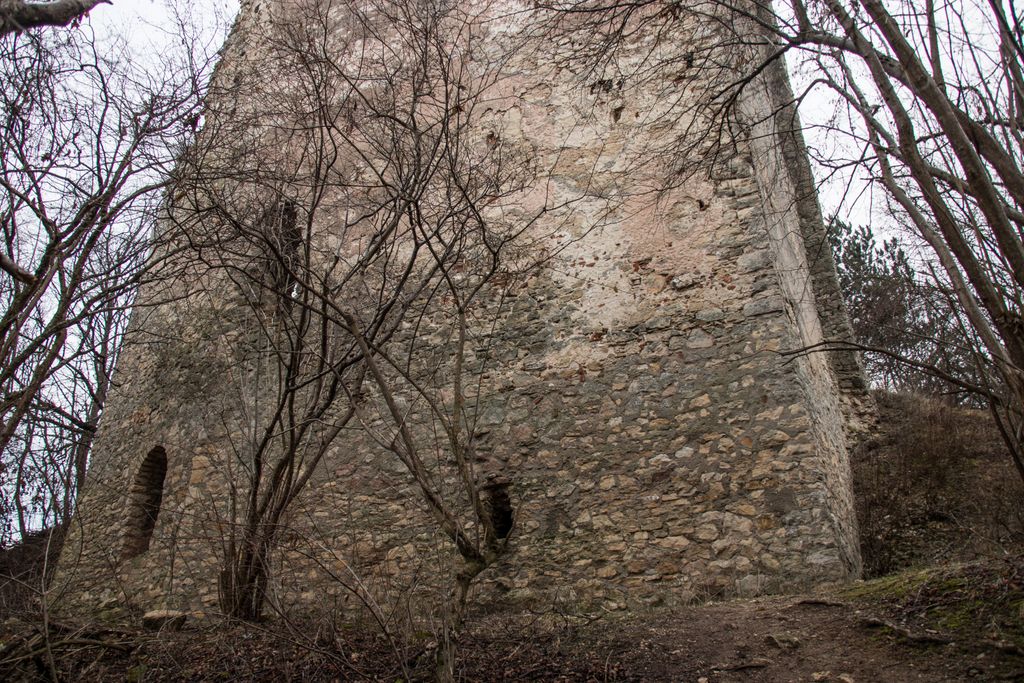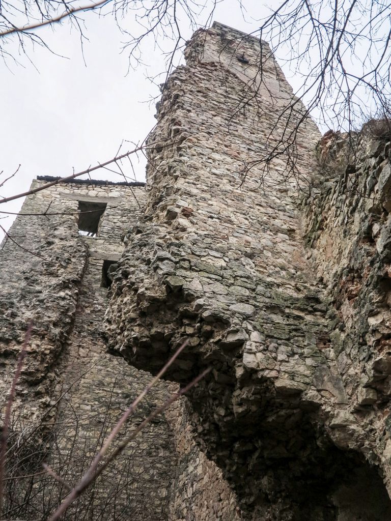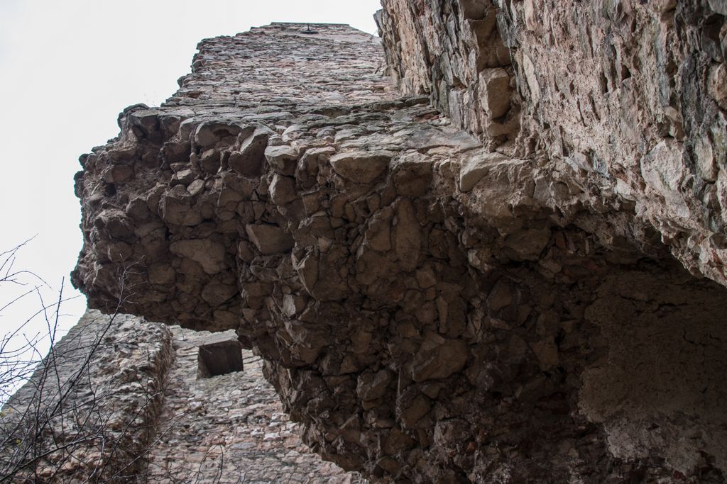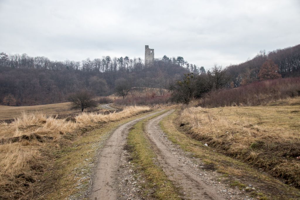drumul te duce către cetate fără a avea nevoie de indicatoare, e de ajuns semnul pus acolo de istorie, adică turnul pe care l-ai văzut încă de departe. Vara, când drumul care urcă către pădure e uscat, accesul se poate face ușor cu mașina, iarna, însă, când e plin de noroi, mai ales dacă ai cauciucuri care doar își mai aduc aminte de striații – chestiile ăstea care fac diferența atunci când vine vorba de aderență pe teren noroios, e altă treabă. Oricum, am urcat cu mașina doar câteva zeci de metri, apoi am oprit-o, culmea, unde era mai mare noroiul, dar nu pentru că nu am mai fi putut urca, însă de ce ai urca chiar până la pădure cu mașina, când o plimbare până acolo e atât de plăcută? Mai ales că gresiile care mărginesc drumul aflat chiar sub cetate sînt, și ele, spectaculoase, iar mașina nu are ce căuta acolo.