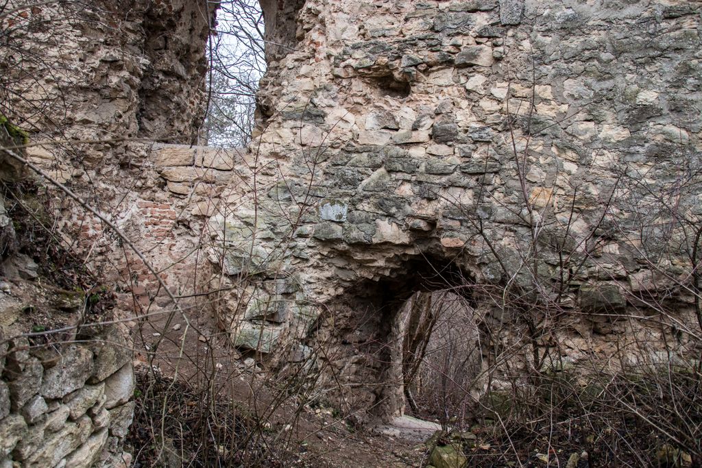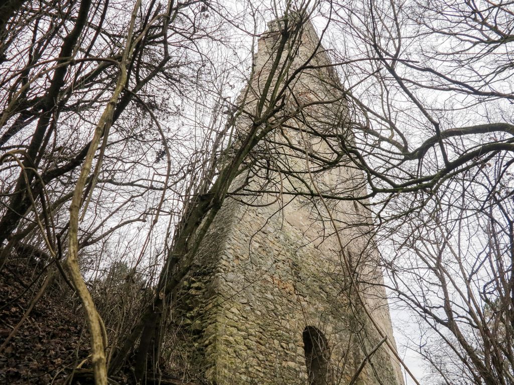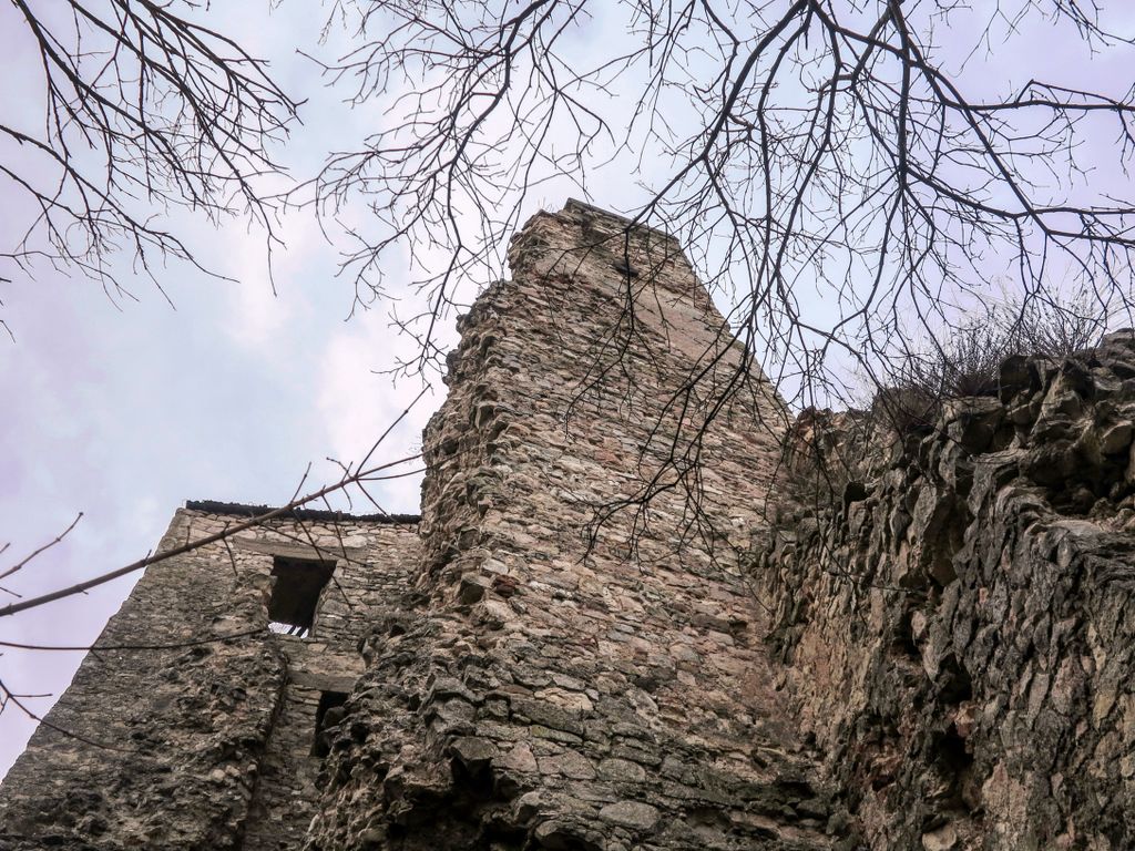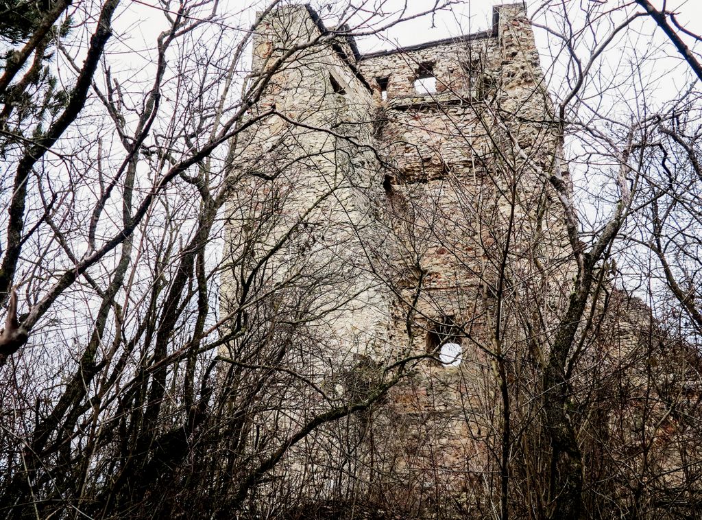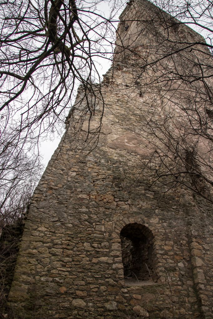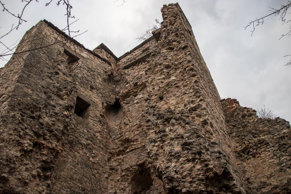 drumul te duce către cetate fără a avea nevoie de indicatoare, e de ajuns semnul pus acolo de istorie, adică turnul pe care l-ai văzut încă de departe. Vara, când drumul care urcă către pădure e uscat, accesul se poate face ușor cu mașina, iarna, însă, când e plin de noroi, mai ales dacă ai cauciucuri care doar își mai aduc aminte de striații – chestiile ăstea care fac diferența atunci când vine vorba de aderență pe teren noroios, e altă treabă. Oricum, am urcat cu mașina doar câteva zeci de metri, apoi am oprit-o, culmea, unde era mai mare noroiul, dar nu pentru că nu am mai fi putut urca, însă de ce ai urca chiar până la pădure cu mașina, când o plimbare până acolo e atât de plăcută? Mai ales că gresiile care mărginesc drumul aflat chiar sub cetate sînt, și ele, spectaculoase, iar mașina nu are ce căuta acolo.