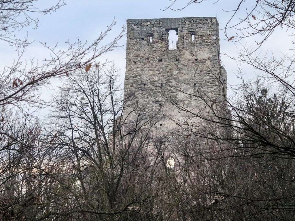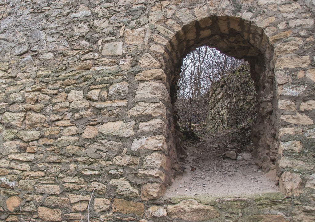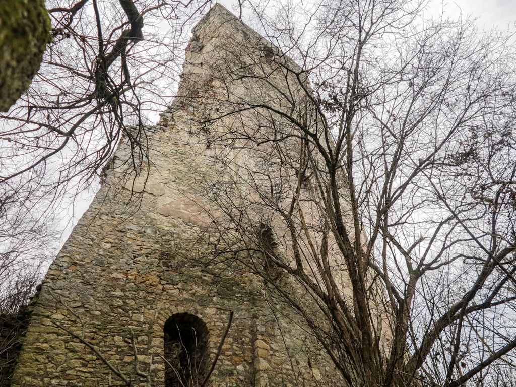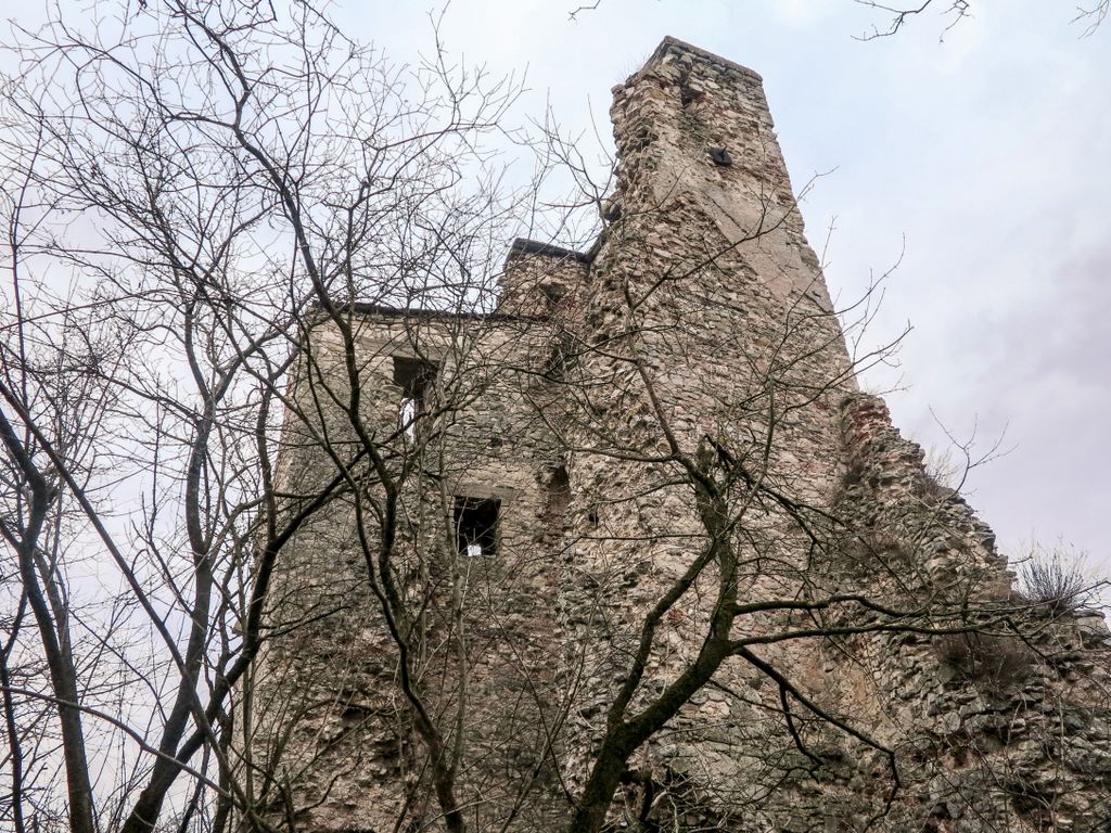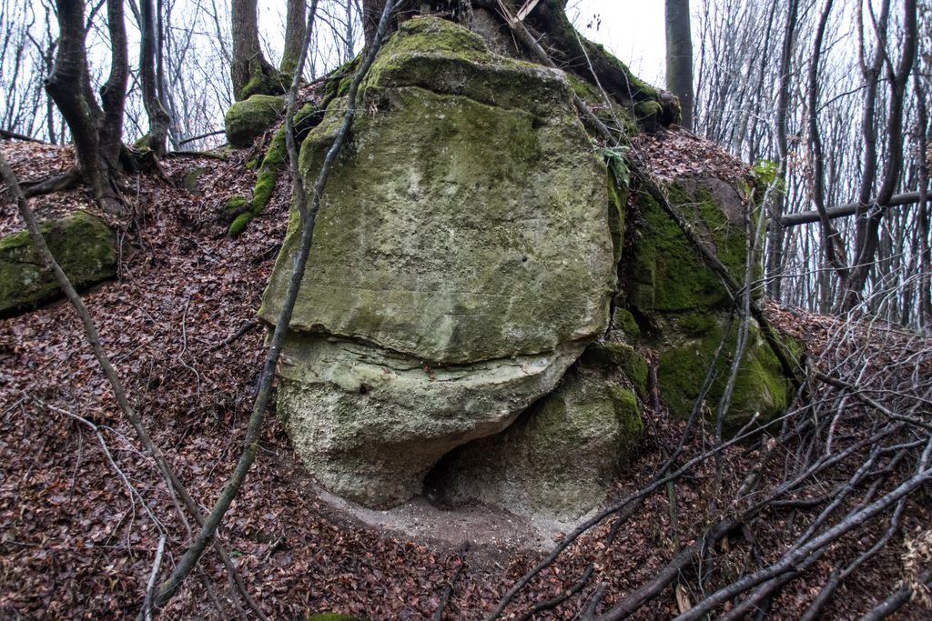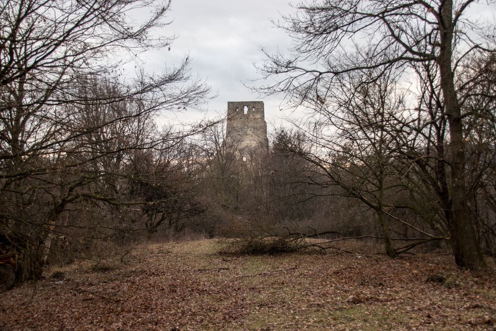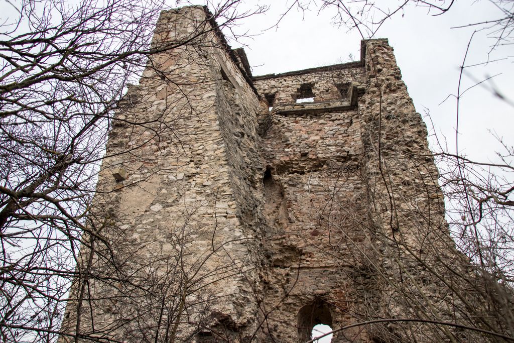drumul te duce către cetate fără a avea nevoie de indicatoare, e de ajuns semnul pus acolo de istorie, adică turnul pe care l-ai văzut încă de departe. Vara, când drumul care urcă către pădure e uscat, accesul se poate face ușor cu mașina, iarna, însă, când e plin de noroi, mai ales dacă ai cauciucuri care doar își mai aduc aminte de striații – chestiile ăstea care fac diferența atunci când vine vorba de aderență pe teren noroios, e altă treabă. Oricum, am urcat cu mașina doar câteva zeci de metri, apoi am oprit-o, culmea, unde era mai mare noroiul, dar nu pentru că nu am mai fi putut urca, însă de ce ai urca chiar până la pădure cu mașina, când o plimbare până acolo e atât de plăcută? Mai ales că gresiile care mărginesc drumul aflat chiar sub cetate sînt, și ele, spectaculoase, iar mașina nu are ce căuta acolo.