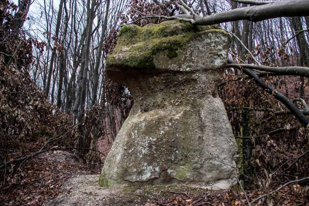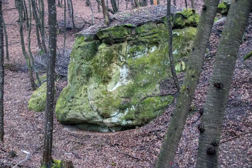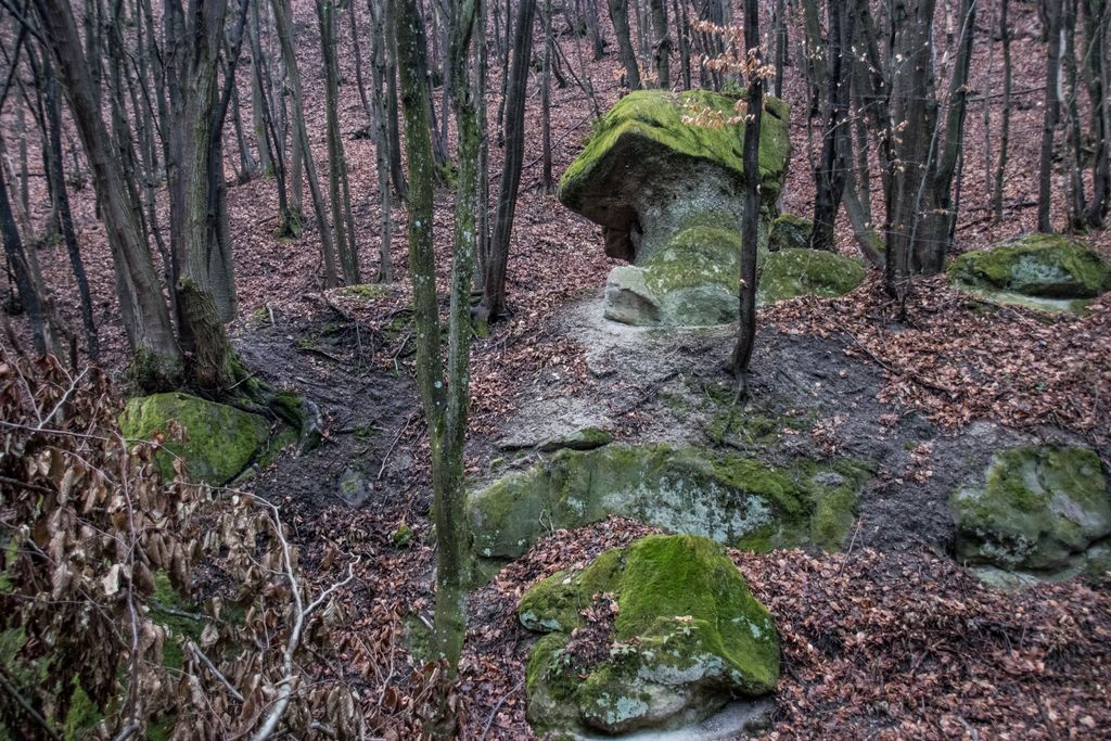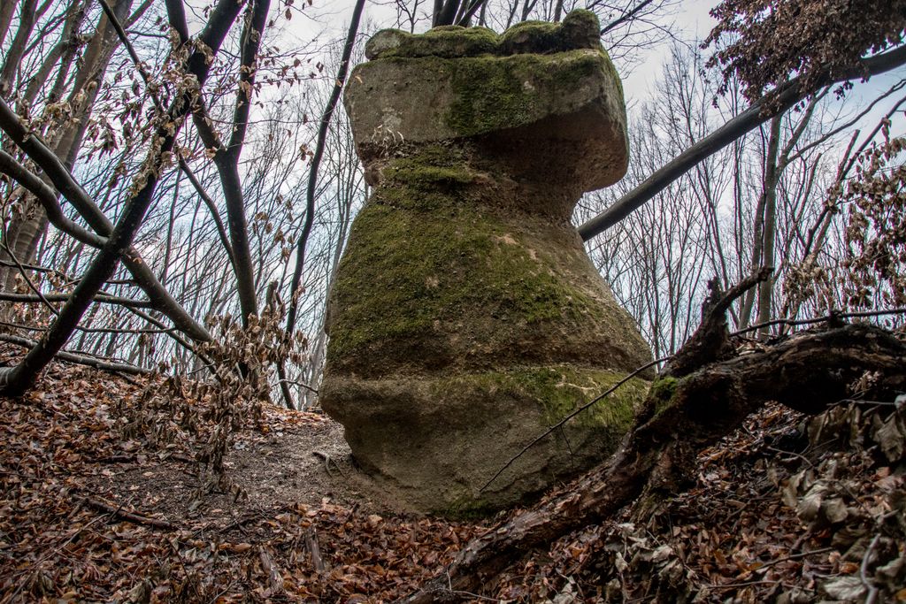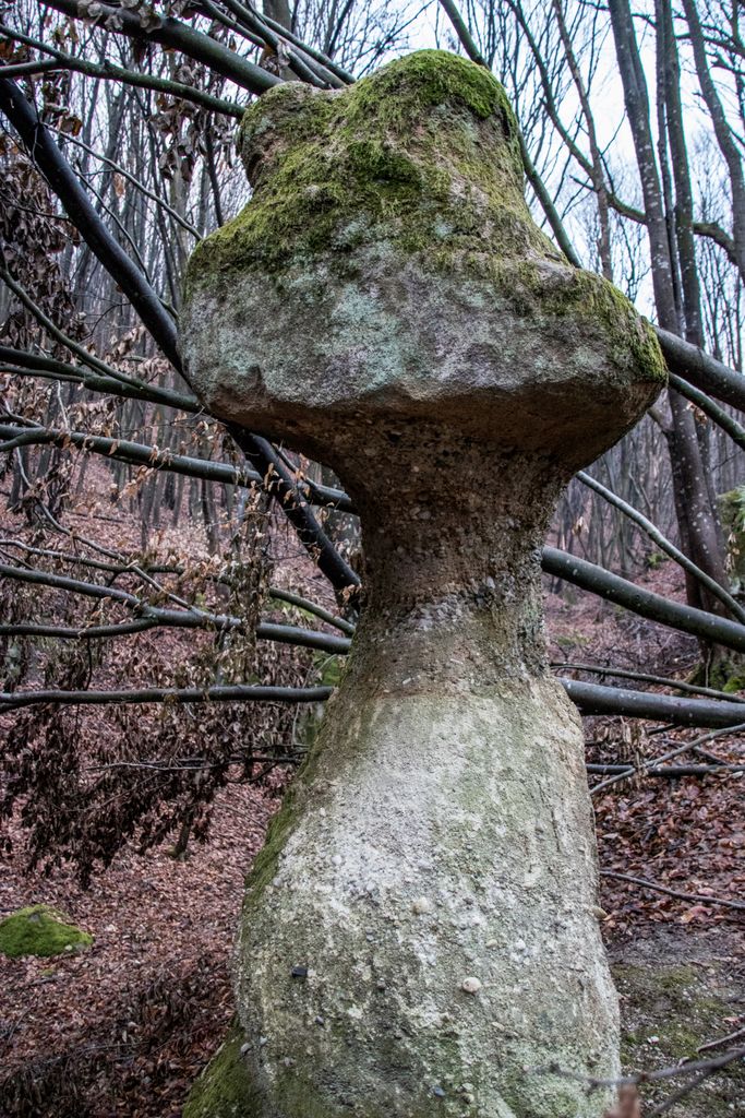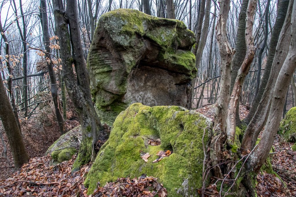 Am coborât de pe culmea dealului pe înserate, grăbind pașii, și nu din cauza înserării, ci pentru că, de sus, privind printre crengile copacilor, chiar aproape de liziera pădurii, niște mogâldețe verzi ne-au atras atenția. Trovanții verzi ai pădurii, fiecare având o formă aparte, fac din micuța vale unde stau ca la habă un loc de poveste. E drept, imaginația are rolul ei aici, însă locul acela chiar are farmecul lui, care, deși tocmai ce ai fost la cetate, și crezi că nu mai are cum să te încânte ceva la fel de mult ca și turnul cetății, te face să te întrebi: a cui operă e mai frumoasă, cea a omului – cetatea, ori cea a naturii – trovanții ăștia verzi? Nu ne-am răspuns la întrebare, pentru că frunmosul e frumos oricine sau orice ar crea acel frumos. Plus că formele acelea acoperite de verde, înfățișând tot felul de animale și ființe misterioase, ba chiar mistice, au dat la o parte întrebările și ne-au îndreptat atenția când spre un trovant, când spre altul: ”uite un cap de șarpe, uite-l pe Kermit, broscoiul din păpușile Muppets, fii atent ce dragon e ăla!, ăstea ce-s, altare ale unor vrăjitori ori sînt niște ciuperci uriașe?”