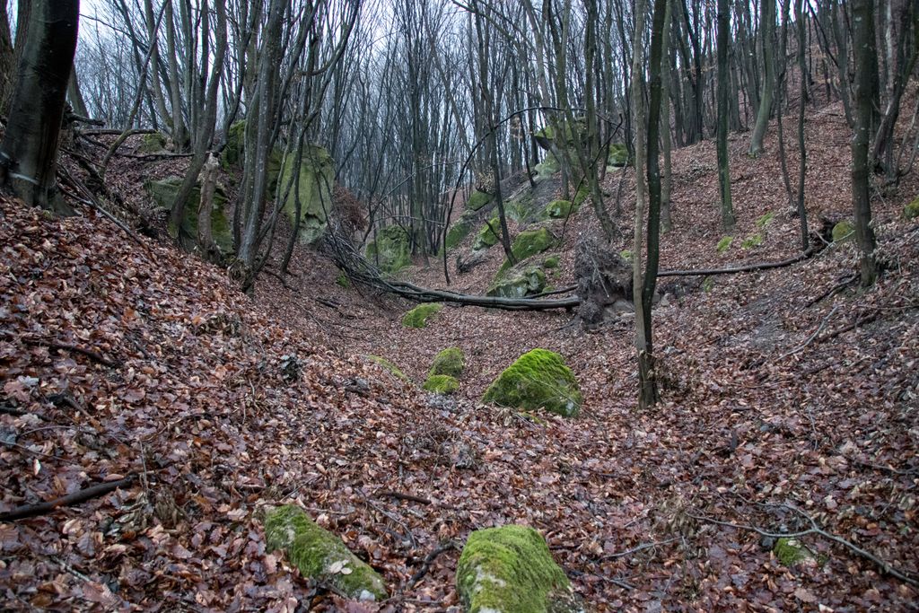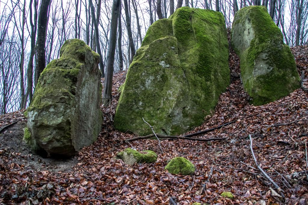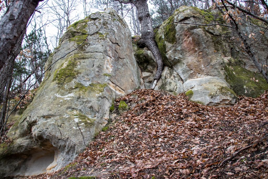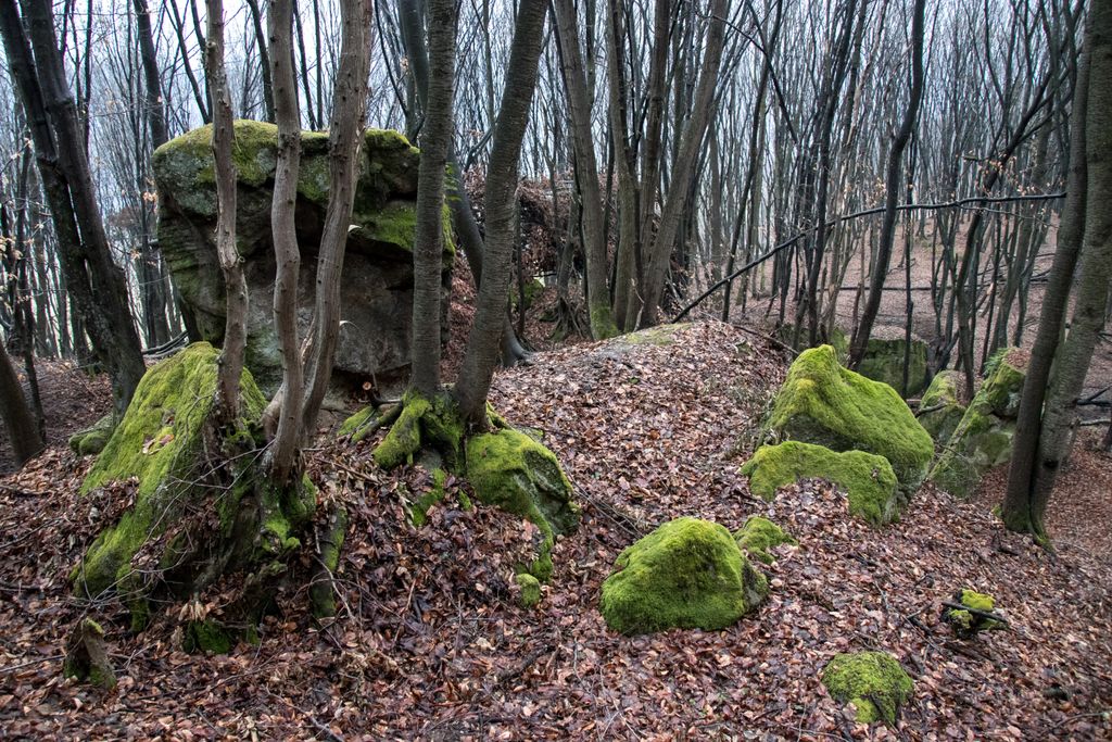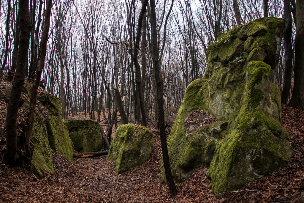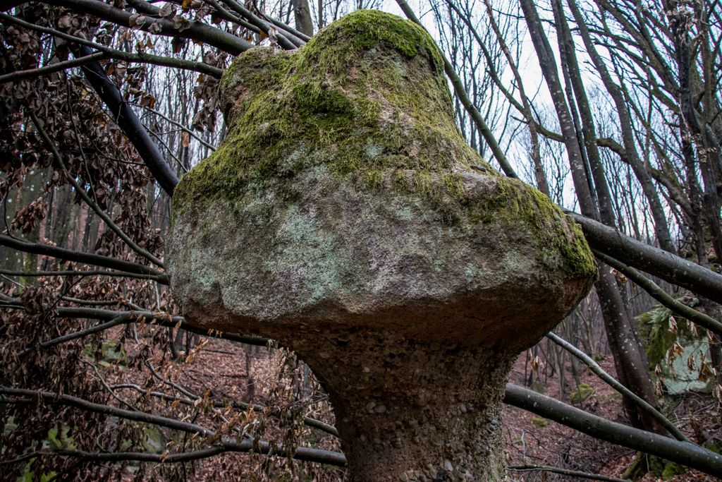 Am coborât de pe culmea dealului pe înserate, grăbind pașii, și nu din cauza înserării, ci pentru că, de sus, privind printre crengile copacilor, chiar aproape de liziera pădurii, niște mogâldețe verzi ne-au atras atenția. Trovanții verzi ai pădurii, fiecare având o formă aparte, fac din micuța vale unde stau ca la habă un loc de poveste. E drept, imaginația are rolul ei aici, însă locul acela chiar are farmecul lui, care, deși tocmai ce ai fost la cetate, și crezi că nu mai are cum să te încânte ceva la fel de mult ca și turnul cetății, te face să te întrebi: a cui operă e mai frumoasă, cea a omului – cetatea, ori cea a naturii – trovanții ăștia verzi? Nu ne-am răspuns la întrebare, pentru că frunmosul e frumos oricine sau orice ar crea acel frumos. Plus că formele acelea acoperite de verde, înfățișând tot felul de animale și ființe misterioase, ba chiar mistice, au dat la o parte întrebările și ne-au îndreptat atenția când spre un trovant, când spre altul: ”uite un cap de șarpe, uite-l pe Kermit, broscoiul din păpușile Muppets, fii atent ce dragon e ăla!, ăstea ce-s, altare ale unor vrăjitori ori sînt niște ciuperci uriașe?”