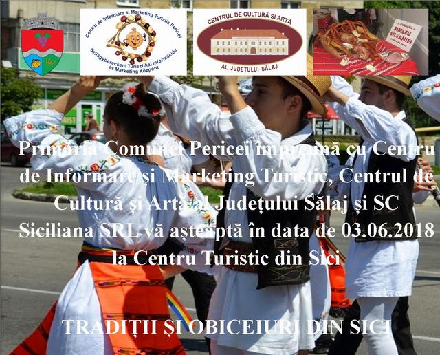Tradițiile și obiceiurile din satul Sici vor fi puse în valoare duminică, 3 iunie 2018, la Centrul Turistic din satul Sici, printr-un eveniment organizat de Primăria Comunei Pericei, împreună cu Centrul de Informare și Marketing Turistic, Cen...