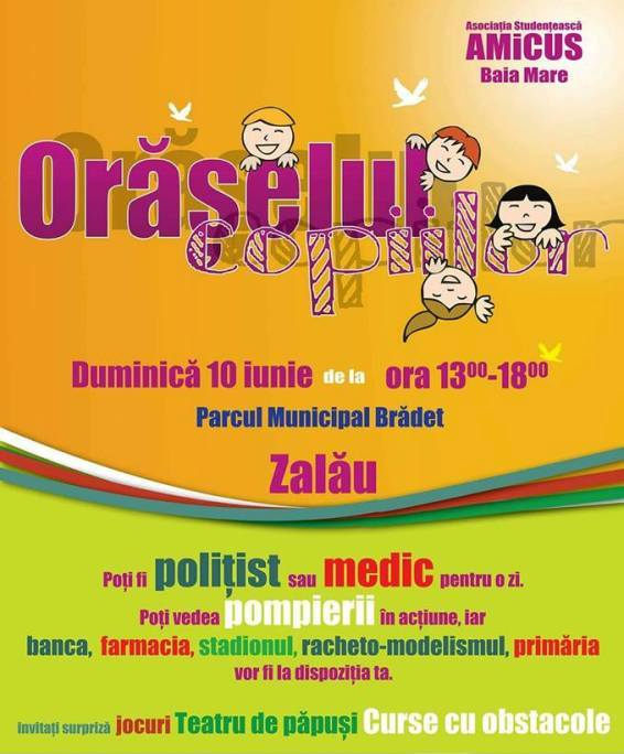 Asociația studențească Amicus Baia Mare organizează duminică, 10 iunie, în Parcul Brădet din Zalău, între orele 13:00 și 18:00, Orășelul Copiilor. Cu această ocazie cei prezenți vor putea lua parte activ la diverse jocuri, urmări te...