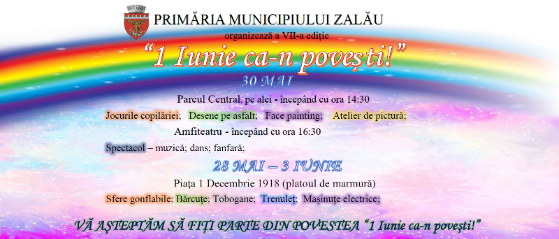 Cea de-a VII-a ediție a evenimentului “1 Iunie ca-n povești”, se va desfășura miercuri, 30 mai, în Parcul Central Municipal, în organizarea Primăriei Municipiului Zalău. Evenimentul este dedicat Zilei Internaționale a Copilului și s...