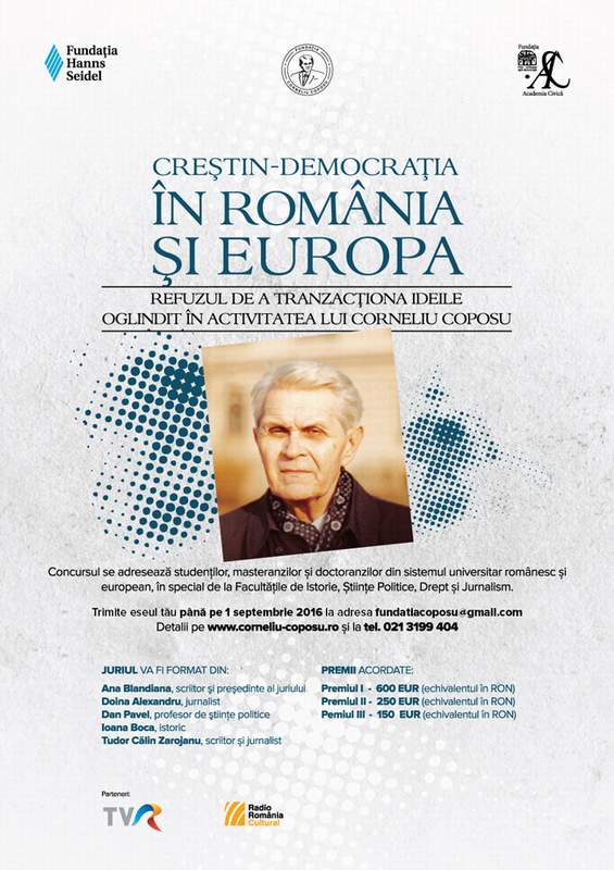 Organizatorii concursului de eseuri intitulat „CREȘTIN-DEMOCRAȚIA ÎN ROMÂNIA ȘI EUROPA – Refuzul de a tranzacționa ideile oglindit în activitatea lui Corneliu Coposu”, a decis prelungirea cu o lună de zile a termenului până la care po...