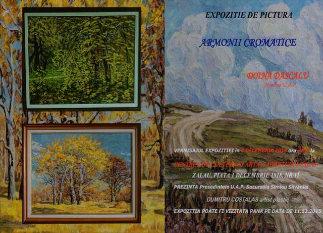 Vernisajul expoziției de pictură „Armonii cromatice”, semnată de artista Doina Dascălu, va avea loc de la ora 12.15, la Centrul de Cultură și Artă al Județului Sălaj (CCAJS), eveniment care face parte din manifestărilor culturale organi...