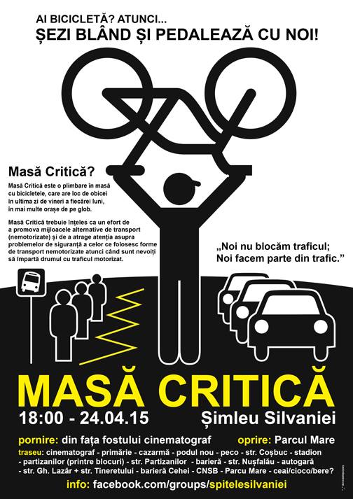 Șimleuanii sunt invitați să participe la o plimbare în masă cu bicicletele, vineri, 24 aprilie, începând cu ora 18.00. Participanții vor pedala pe un traseu de 18 km, fără a părăsi orașul, iar startul se va da din fața fostului Cinemato...
