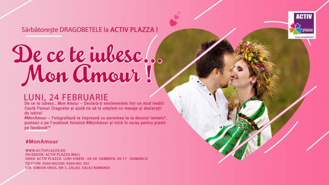 Ziua lui Dragobete, simbolul iubirii la români, va fi sărbătorit luni, 24 februarie în Activ Plazza din Zalău. "De ce te iubesc…Mon Amour – Declară-ți sentimentele într-un mod inedit! Caută panoul dragostei și ajută-ne să le u...