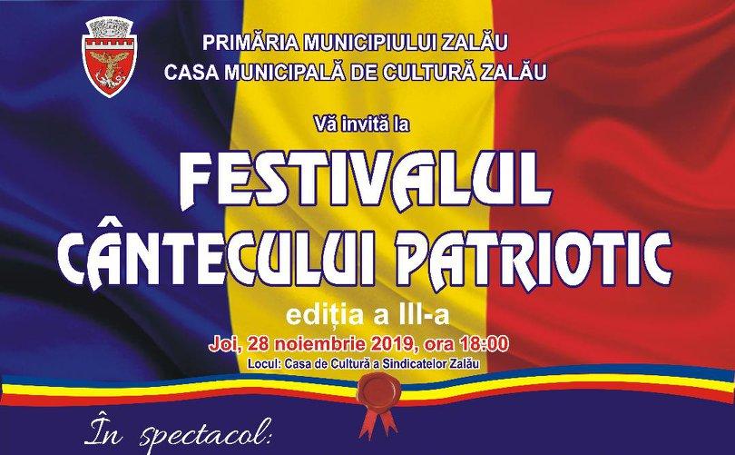 Cea de-a treia ediție a Festivalului Cântecului Patriotic va avea loc joi, 28 noiembrie 2019, începând cu ora 18:00, la Casa de Cultură a Sindicatelor Zalău, un eveniment organizat de Primăria Municipiului Zalău şi Casa Municipală de Cultu...