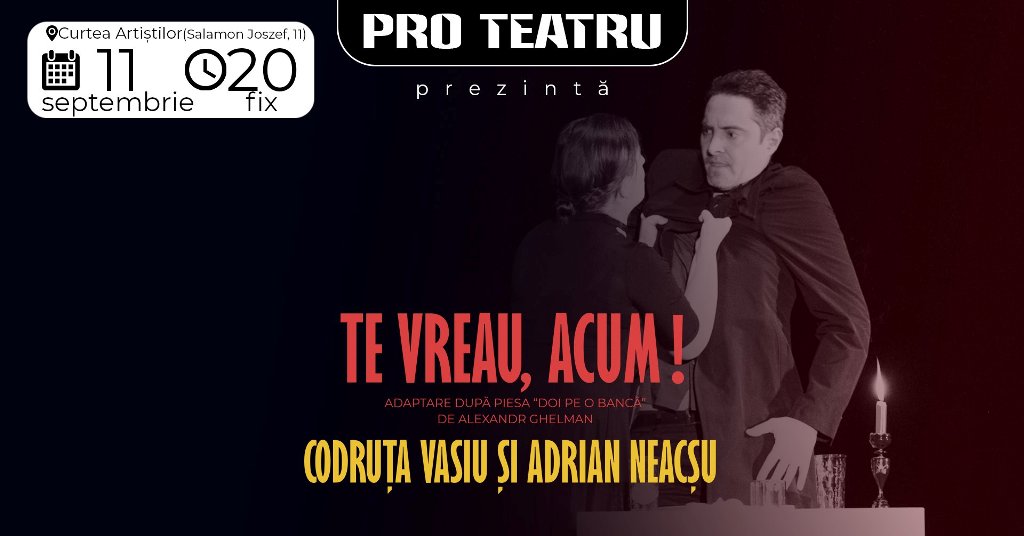 Piesa de teatru propusă de reprezentanții Pro Teatru pentru miercuri, 11 septembrie, de la ora 20:00, în Curtea Artiștilor este „ Te vreau, acum! ” .O poveste emoționantă cu Adrian Neacșu și Codruța Vasiu în care adevăruri...