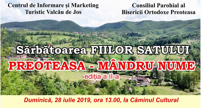 Centrul de Informare și Marketing Turistic Valcău de Jos și Consiliul Parohial al Bisericii Ortodoxe Preoteasa organizează cea de-a doua ediție a sărbătorii Fiilor satului ”Preoteasa mândru nume”, duminică, 28 iulie 2019, ora 13.00, la ...