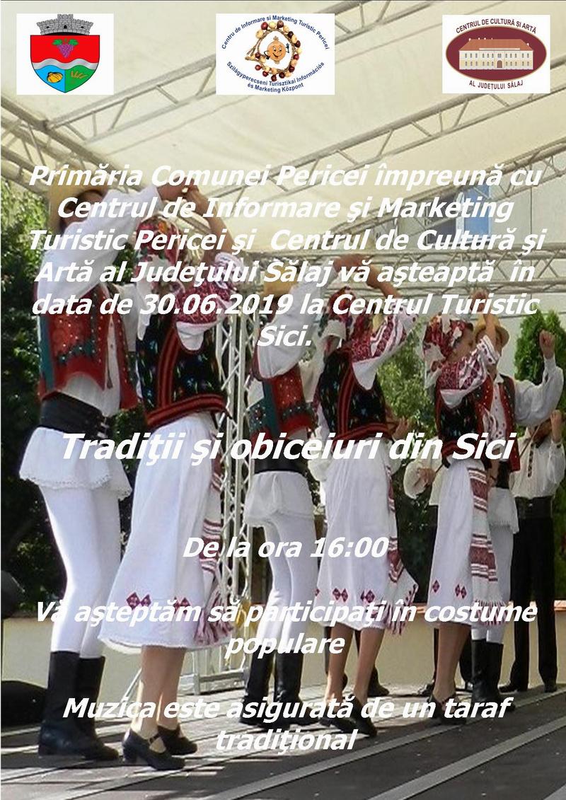 Primăria comunei Pericei împreună cu Centrul de Informare și Marketing Turistic Pericei și Centrul de Cultură și Artă al Județului Sălaj organizează, duminică, 30 iunie 2019, de la ora 16, la Centrul Turistic Sici, ”Tradiții și obice...