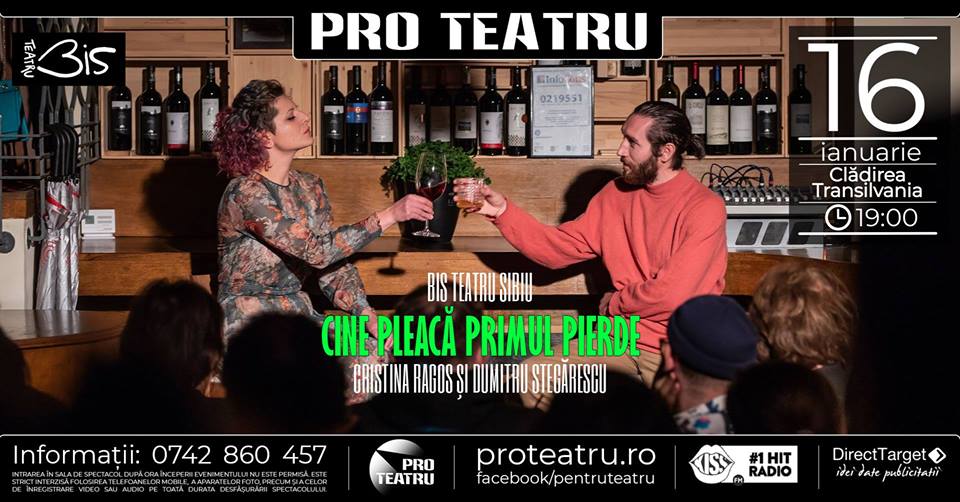 Spectacolul „Cine pleacă primul pierde” producţie a Teatrului BIS, în organizarea Pro Teatru, va avea loc miercuri, 16 ianuarie 2019, de la 19:00. Informații și rezervări: 0742 860 457. În adolescență un el și o ea pot fi pr...