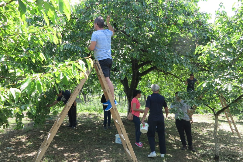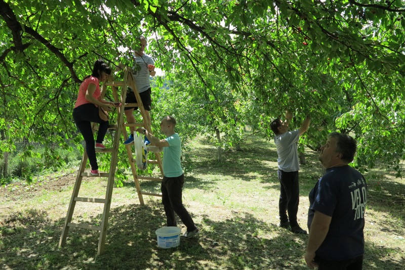 lui Marius s-a iscat o hărmălaie plină de bucurie încât gazda noastră nici nu se mai auzea de gurile noastre: „Vaaai, da, ce frumos e la tine, aici, zici că-i raiul pe pământ. Da, păi așa și e la noi, ca vorba aia: când îi vreme rea îi bai, când e vreme bună-i rai. Mmmm, da aveți și căpșuni?! Da, ce buni îs. Ce grozave îs cireșele astea, comoară în copaci, 50 de lei perechea. Ne îmbogățim, de le vindem. Ce i-ar fi plăcut și lui Călin. Ce păcat că nu a putut fi și el aici. Mâncați cât puteți, plata se face la plecare. Mută scara mai încoace, că aici sunt mai coapte. Dați-mi careva și mie o găleată, că nu mai am unde să le pun. Mi-am pătat tricoul dar ce mai contează, oricum a costat mai puțin decât cireșele astea. Nu am mai mâncat cireșe, direct din pom, de zeci de ani, și pentru mine liliacul, cireșele și zmeura înseamnă casa bunicilor și nostalgia copilăriei. Sunt acel ceva care mă trimit înapoi în timp.“ Și în gălăgia generală, vocea lui Marius care zicea că el a altoit o parte din cireși, abia se mai auzea.