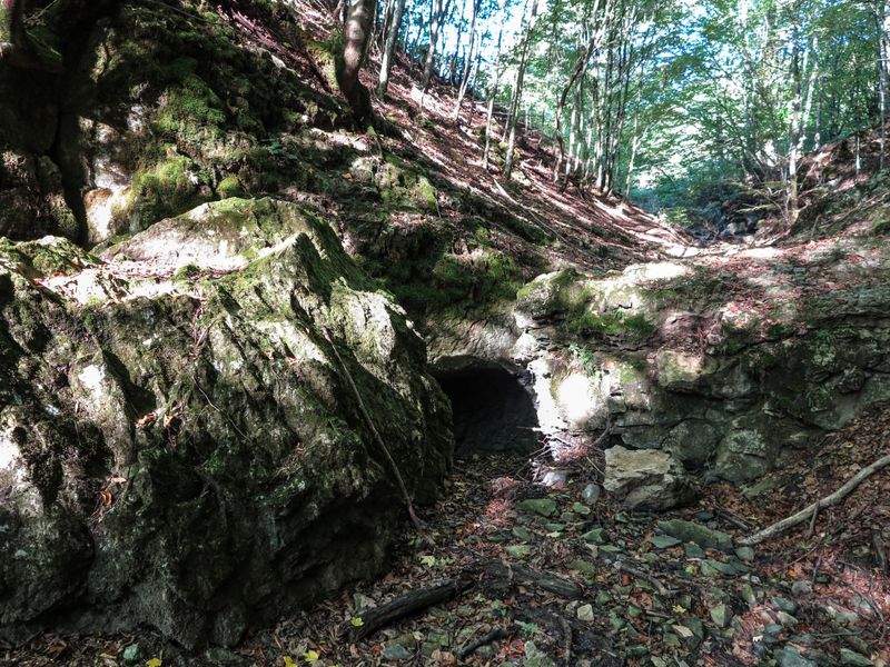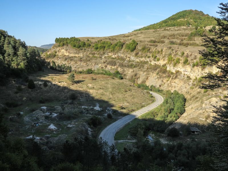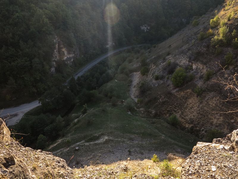 Pantele foarte abrupte ale pădurii în care tocmai am intrat nu sînt un semn foarte bun, în sensul că nu prea pare sigur să cobori pe acolo. Așa că am mers mai departe, în căutarea unui loc de coborâre. Care a întârziat să apară, pe bună dreptate, așa cum am putut să văd odată ce am ajuns la drum, câteva zeci de minute mai târziu. Totuși, la un moment dat, de unde eram, printre copaci, se vedea un loc care părea accesibil și care ducea în locul în care se vedeau rămășițele unor cuptoare vechi de ars varul, una din ocupațiile oamenilor locurilor (Baba și Poiana Blenchii), acum ceva vreme. Dar, ca să ajung acolo, trebuia urmată un fel de brână, dedesubtul căreia se putea ghici cu ușurință peretele vertical al stâncii. Și am trecut peste brână, ba chiar m-am oprit să fac câteva poze, pentru că priveliștea chiar merita să stai în echilibru pe brâna alunecoasă de sub picioare.