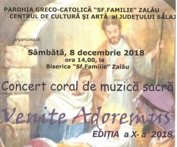 Ansambluri corale din Zalău, Șimleu Silvaniei, Bistrița-Năsăud și Sighetu-Marmației vor fi prezente la a zecea ediție a Concertului coral de muzică sacră ”Venite Adoremus”, care va avea loc sâmbătă, 8 decembrie 2018, ora 14.00, la Biserica „Sf. Familie” Zalău.