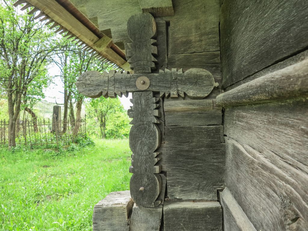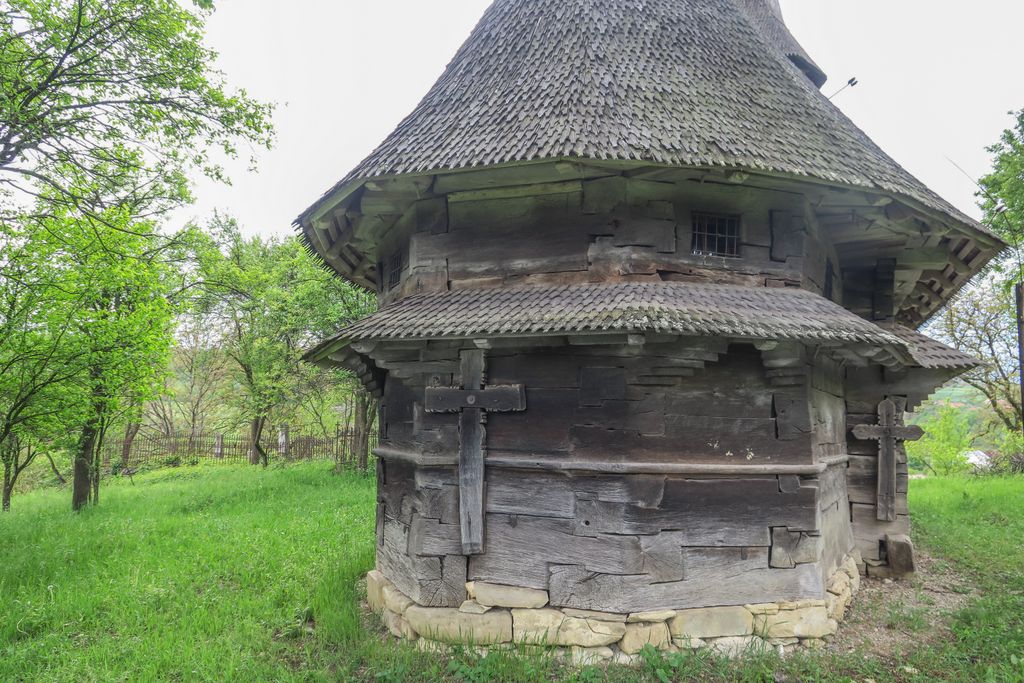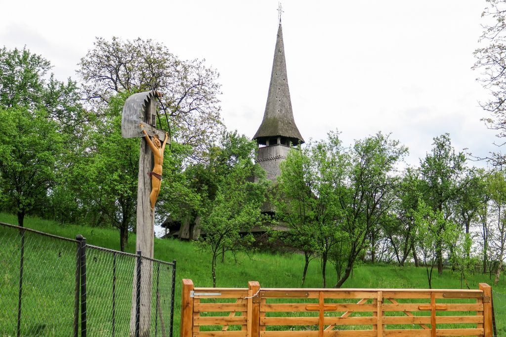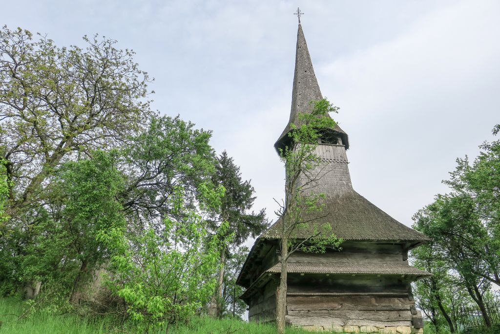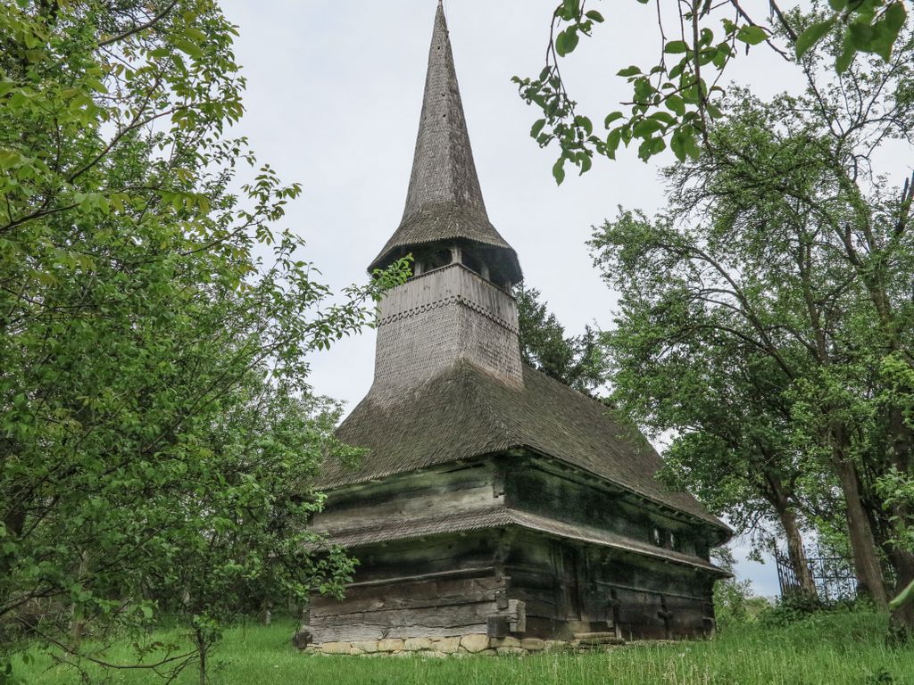 Acuma, nu știu dacă ghionoaia și-o fi dat seama că mi-era drag de ea, cum stătea cocoțată în vârful turnului clopotniței, glăsuind pe limba ei cât putea de tare, cert e că nu părea prea deranjată și stătea, așa, cu ochii ațintiți la lemnul pe care-l găurise cu ciocul ei mare, aproape nemișcată. Apoi, până să apuc să apăs de două ori pe declanșatorul aparatului de fotografiat, și-a luat zborul, spunându-mi ceva în graiul ei cu mulți decibeli. Eu am luat vorbăraia de bine, un fel de încuviințare de a mă apropia de biserica de lemn de pe moșia ei, să o văd mai de aproape. Din afară. Că oricât ne-am uitat după careva de-al locului, care să ne ajute să intrăm înăuntru, nici țipenie de om. Doar înainte să ne pregătim de plecare, un bărbat a trecut pe uliță, împreună cu un câine, dar părea așa de în lumea lui, cărându-și sapa pe umăr, că n-am mai vrut să îl deranjăm cu ale noastre. L-am lăsat să-și vadă de drum și am dat ocol bisericii de mai multe ori, privind și atingând lemnul vechi cu care a fost construită.