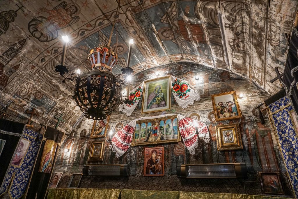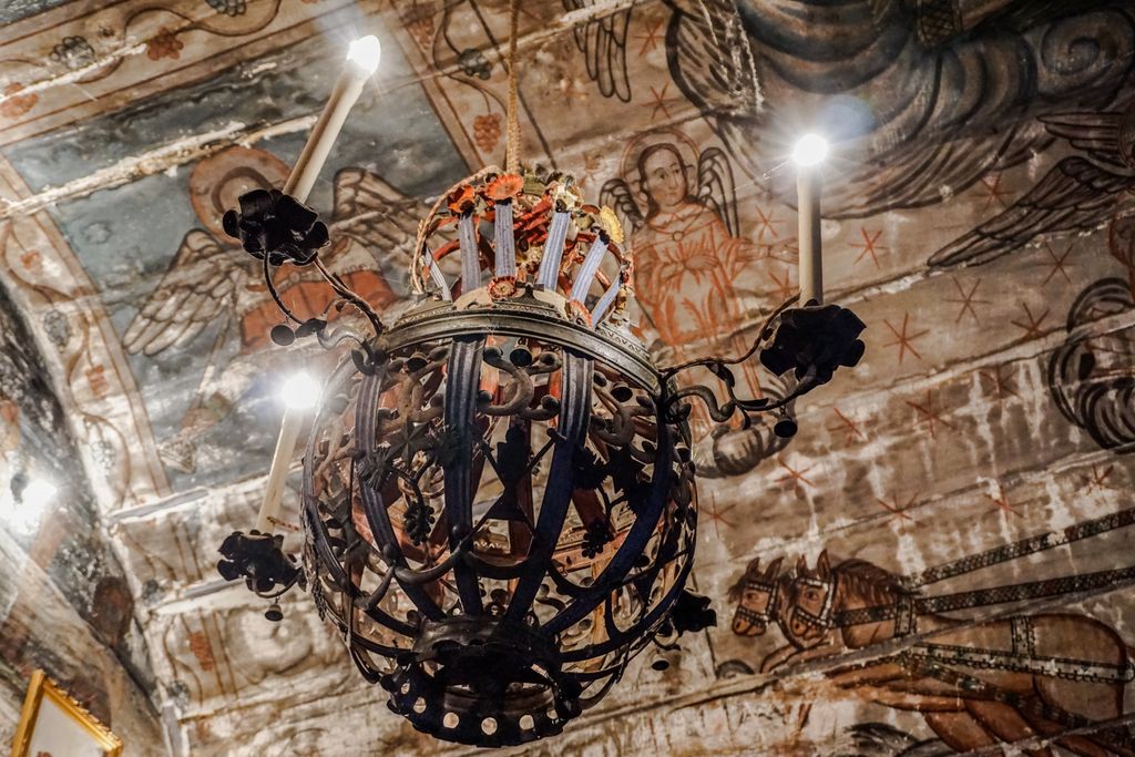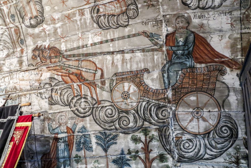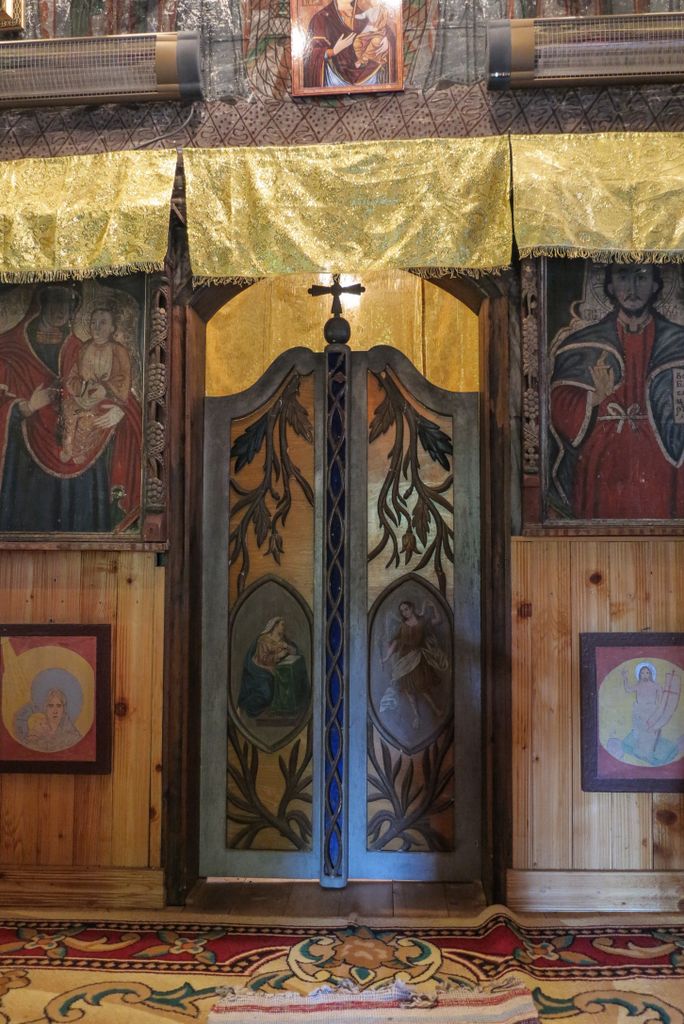 Am spus că e îngrijită. Însă corect ar fi ”prea îngrijită”. În interiorul bisericii, lambriurile acoperă picturile de pe pereți, doar cele de pe bolta semicilindrică ori de pe pereții naosului mai fiind la vedere, niște picturi aflate într-o stare destul de bună. Însă lambriurile… Vorba sfătului: ”Din prea multă grijă, s-a făcut mai mult rău”. Oricum, chiar și așa, cu lambriurile ăstea deloc potrivite pentru un astfel de locaș de cult, biserica de lemn din Purcăreț, monument istoric, de altfel, e destul de îngrijită, deși niște lucrări de recondiționare sînt absolut necesare. pentru a se păstra locașul de cult. Bani, însă…