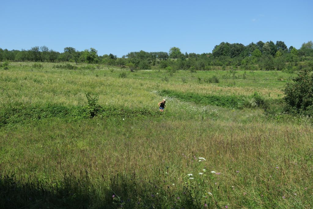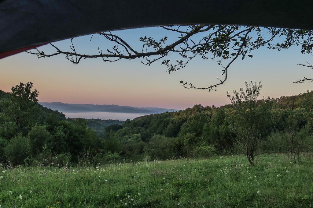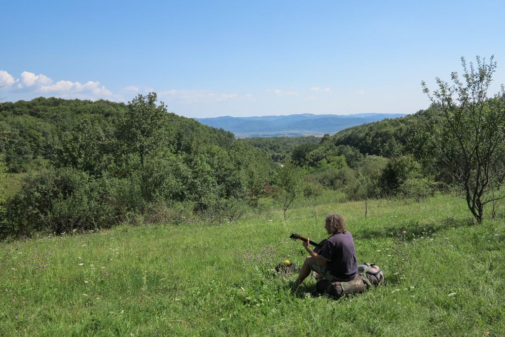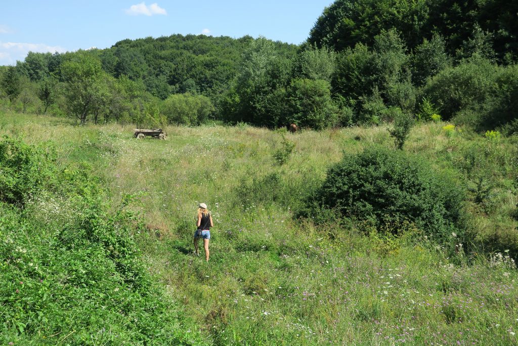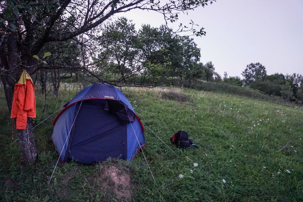 Am găsit locul în care să așezăm tabăra destul de repede, un loc izolat, nu foarte departe de sat, dar nici foarte aproape. Și am știut că ăsta e locul, dar, totuși, am zis să mergem în recunoaștere, poate este un loc și mai frumos, așa că, sub un soare torid, timp de o oră și ceva, am tot umblat încolo și încoace, pentru ca, în final, să ne așezăm cortul în locul în care ne-am hotărât de la început. Dar de ce să stăm liniștiți, când putem să umblăm aiurea, prin sauna asta naturală, făcându-ne, astfel, să mergem pe traseu de abia la 6 fără un pic seara, lucru care înseamnă să comprimăm un traseu de vreo 4 ore, în 3 ore? Adică să tragem ca nebunii pe pantele abrupte.