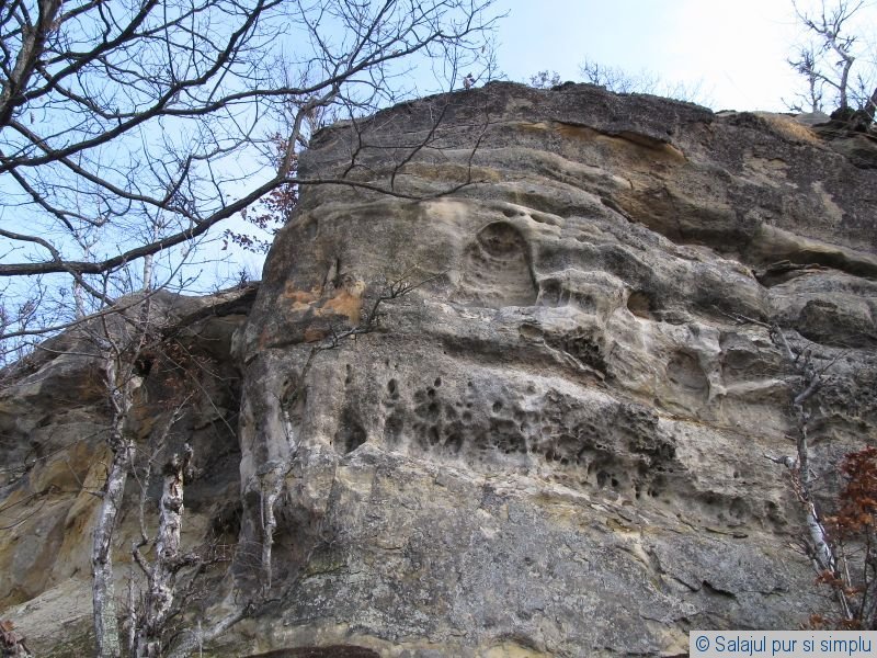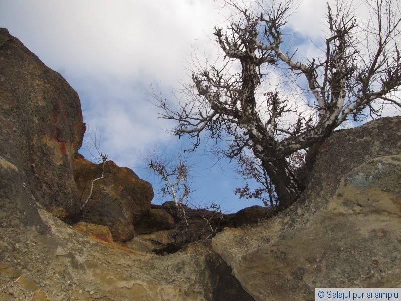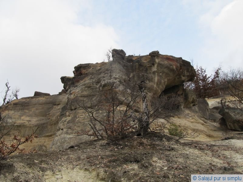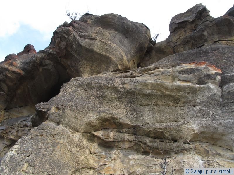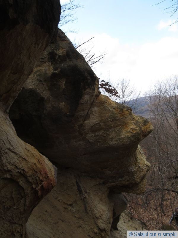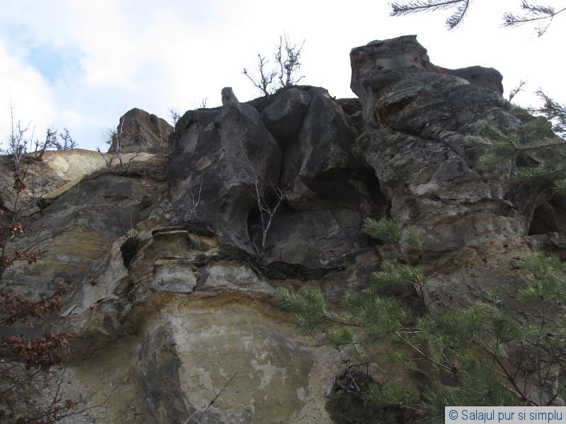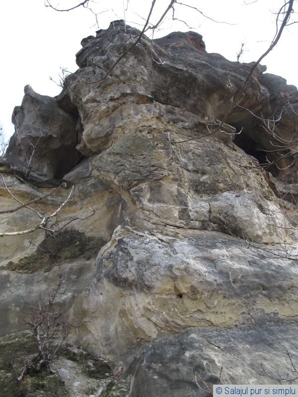 E clar că niciunul dintre noi nu este apt complet pentru un exercițiu de forță, dar tocmai în asta constau provocările – să treci mereu și mereu peste limitele tale. Luăm, deci, cu asalt povîrnișul abrupt – sînt cam 150 de metri de urcat pînă la peșteră, dar extenuarea își spune rapid cuvîntul. Suflăm din ce în ce mai greu, iar terenul este accidentat de văi adînci, pe care mereu trebuie să le ocolești. Ne ia cam o jumătate de oră lupta cu panta, dar culmile golașe la baza cărora am ajuns ne spulberă orice oboseală: nisip fin, cum s-a erodat calcarul, ziduri semețe, pe care sînt dispuse, ici colo, inexplicabil, niște mesteceni ce seamănă mai degrabă cu niște tufe. Înconjurăm cu grijă baza stîncii, totul se năruie sub pașii noștri, iar gura peșterii Buhii apare deasupra noastră, neagră și amenințătoare.