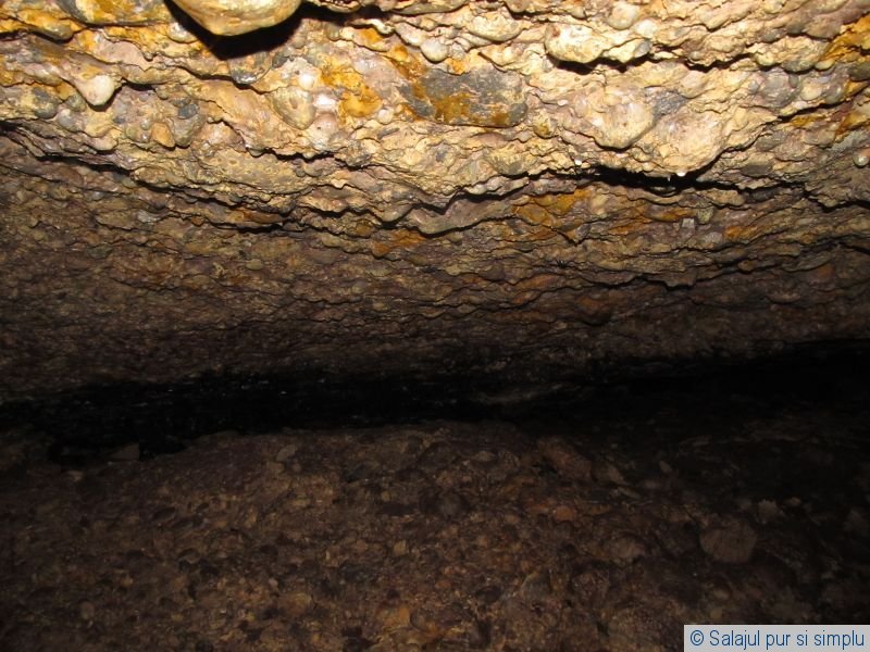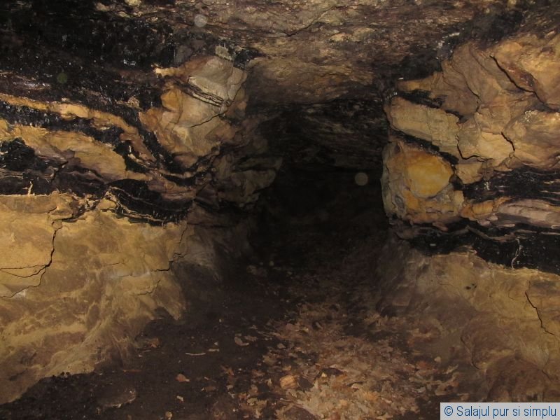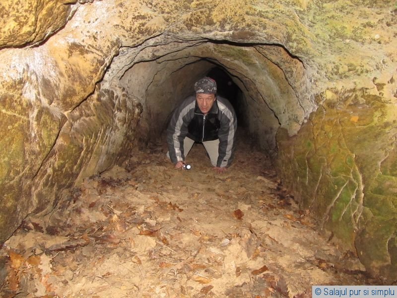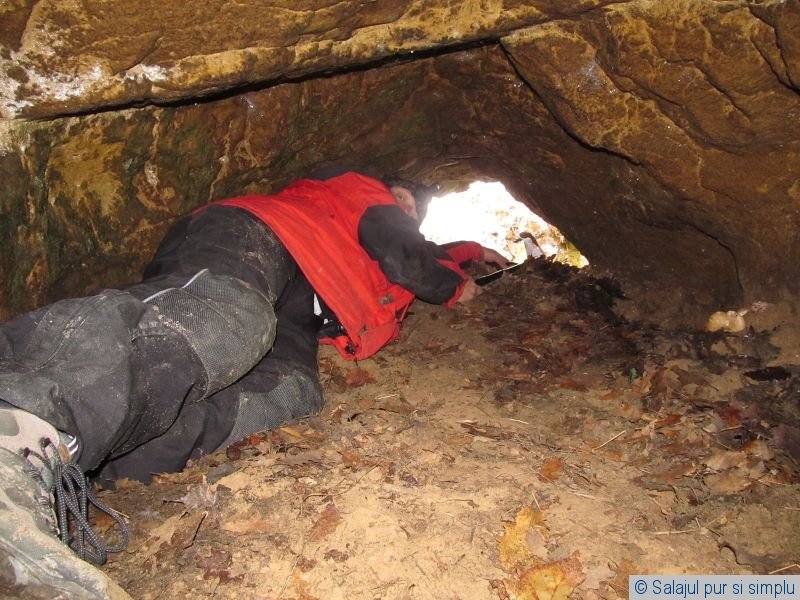 Ajung, în cele din urmă, la o gaură mică, cît un horn, în apropierea căreia mă cuprinde instantaneu o stare neplăcută. Ajunge și Călin lîngă mine și se pune pe burtă să intre în negura hrubii. Cum pune lanterna în față, îl aud exclamînd că e un adevărat tunel în fața lui. I-au mai rămas doar tălpile picioarelor afară, restul corpului deja i-a dispărut în hornul strîmt. Atunci îmi dau seama ce e în neregulă: putoarea mucegăită ce venea din interiorul găurii, un iz atît de neplăcut, încît mi se face greață instantaneu. Între timp, Călin dispare în hornul strîmt și degeaba strig după el, nu mai primesc nici un răspuns. Chestiile astea pot fi periculoase, inconștiența te poate lovi instantaneu, deci, deși chiar nu am avut de gînd să intru, îmi arunc rapid rucsacul din spate, închid toate fermoarele de pe mine, mă arunc pe burtă și încept să ma tîrăsc spre interiorul găurii împuțite. Curios, singurul lucru ce îmi vine în minte, chiar nu are nici o legătură cu situația actuală: mi-am amintit de locotenentul din armată, sadic rău, care urla la noi: ”tîrîți-vă pe burtă, porcilor, prin noroaiele patriei!”.