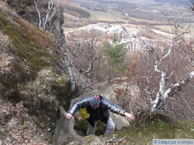 Acum, poate toate încercările noastre de a ajunge în peșteră par stupide pentru majoritatea unora. Am luat zidul cu asalt, de-a dreptul, dar bucăți mari de calcar s-au prăbușit chiar și la atingerea noastră. Am încercat și din lateral, același rezultat. Cam 7 metri ar fi de urcat pînă la gura peșterii, dar pe lîngă faptul că e foarte sfărîmiciosă gresia, mai face și burți, peste care efectiv nu ai cum să treci, dacă nu ești ancorat. Iar noi sîntem deja la o înălțime apreciabilă, deci orice mișcare greșită ne-ar arunca în golul de câteva zeci de metri adîncime. Avînd la noi corzi, ne-am gîndit să rupem gura peșterii de sus, de pe coardă, balansîndu-ne din gol, dar stînca e atît de goală, încît nu găsim nici măcar un punct solid de care să legăm coarda. Senzația amară de eșec e doar în parte spulberată de cucerirea piscului, pe care ne așezăm privind în gol, după o altă tură istovitoare de înconjurare a zidului, pentru găsirea unui loc de acces spre culme.