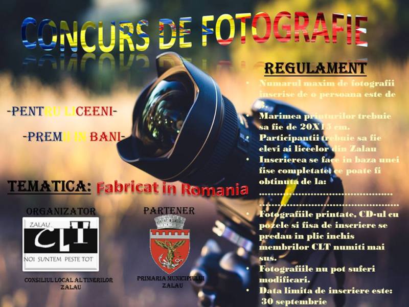 Concursul de fotografie cu tema „Fabricat în România“, organizat de către Consiliul Local al Tinerilor Zalau în colaborare cu Primăria Municipiului Zalău, va avea loc, vineri, 3 octombrie 2014. Cu această ocazie, organizatorii invită elevii liceelor din Zalău să surprindă aspecte plăcute sau neplăcute, definitorii pentru ţara noastră şi să-şi lase imaginaţia să-i conducă la poza care ar reprezenta cel mai bine tema „Fabricat în România“. Data limita de înscriere este 30 septembrie, numărul maxim de fotografii cu care se poate participa fiind de trei. Fotografiile, înscrise în concurs, trebuie să aibă dimensiunile de 20×13, fotografiile printate, CD-ul cu poze şi fişa de înscriere urmând a fi predate membrilor Consiliului Local al Tinerilor Zalău. Fişele de înscriere se pot obţine de la: Patri Mitrea – Colegiul Naţional „Silvania“ şi Sortan Raluca Ştefana – Colegiul Tehnic „Alesandru Papiu Ilarian” (API). Premiile vor consta în sume de bani, respectiv: locul 1- 300 RON, locul 2- 200 RON şi locul 3- 100 RON.