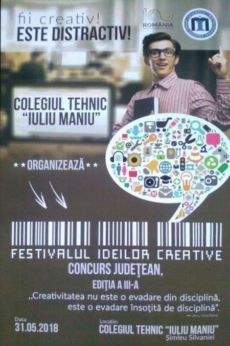 Colegiul Tehnic „Iuliu Maniu” Şimleu Silvaniei organizează, miercuri, 30 mai 2018, a III-a ediţie a Concursului Regional „Festivalul Ideilor Creative”. Astfel, în cadrul competiţiei sunt așteptați să participe elevi de la școlile din Sălaj și din alte județe, din clasele VII – XII, ocazie cu care aceștia își pot prezenta sau exprima ideile originale şi interesante în patru domenii: tehnic, științe-informatică, economic, creație artistică (muzicală, plastică, literară).
