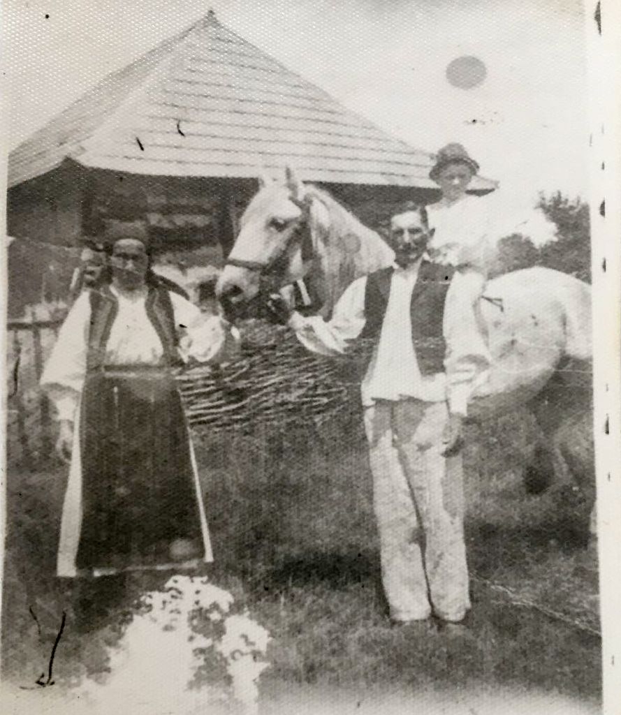 „Au venit sara. Noi îmblătem ruje. Avem ruje tietă. S-o băgat până ne-o umplut casa și s-o culcat toți jos. La noi o fost bucătărie rușilor. Și-n ogradă o fost o sută și ceva dă cară. Cu cai, cu boi, cu ce-o fost. Dimineața am țâpat caii la pășune în ogradă. O văzut tătuța că un rus o mărs în ogradă și s-o uitat pă dâncoace și pă dâncolo. Și o zâs tătuța, ˂Domne iartă-l!˃„ Mă, ar trebui să iei caii și-i duci d’ aci că ni-i-or lua aiște” Și m-am dus cu caii până la Rât, unde o fost grajdurile colectivului. Acolo m-am întânit cu Crăciunea Țuțului și cu alții cu cai. Am stat și io cu ii. Rușii o mărs în ogradă și o căutat caii. O văzut că nu-s caii. I-o căutat pă teren. O venit acolo la noi și o luat: o iapă, una era știoapă un pic dă picior. Avem și un mânz mic. O dus caii la jidovi, acolo erau o grămadă de ofițeri. Și aci la noi erau. Aveau o bucată mare dă carne pă masă. Tăieu și mâncau. Aveau și șapte-opt animale pe care le tăieu și făceau mâncare. Pălincă aveu pă masă, erau morți dă beți. Făceau foc. Curetiul tăt ni l-o cules. La Petre Ioanii Pavelii s-o mai instalat, la secretaru, la toate casele de pe lângă drum. Cei de la masă au văzut ca suntem necăjiți după cai. Și-un ofițer beat ne-o făcut semne. O mânat pă un rus să aducă un cal. Ofițerul s-o urcat pă cal și o adus caii noștri. Ni-i-o scos caii. O scăpat caii! Și m-am dus cu ii, știi indi? O avut Găvrila Ioanii Florii vie lângă Sodoale. Acolo avem și noi pământ, mai încolo un pic. Și m-o lăsat pă mine cu caii și cu boii Găvrilii Ioanii Florii. Am stat sângur tătă zua să păzăsc animalele. Aveam vreo 12 ani”.