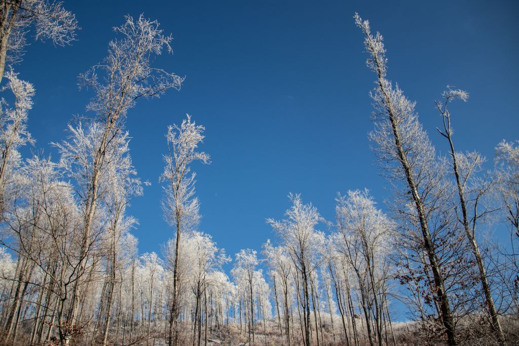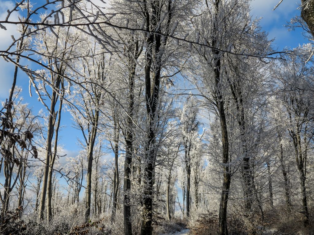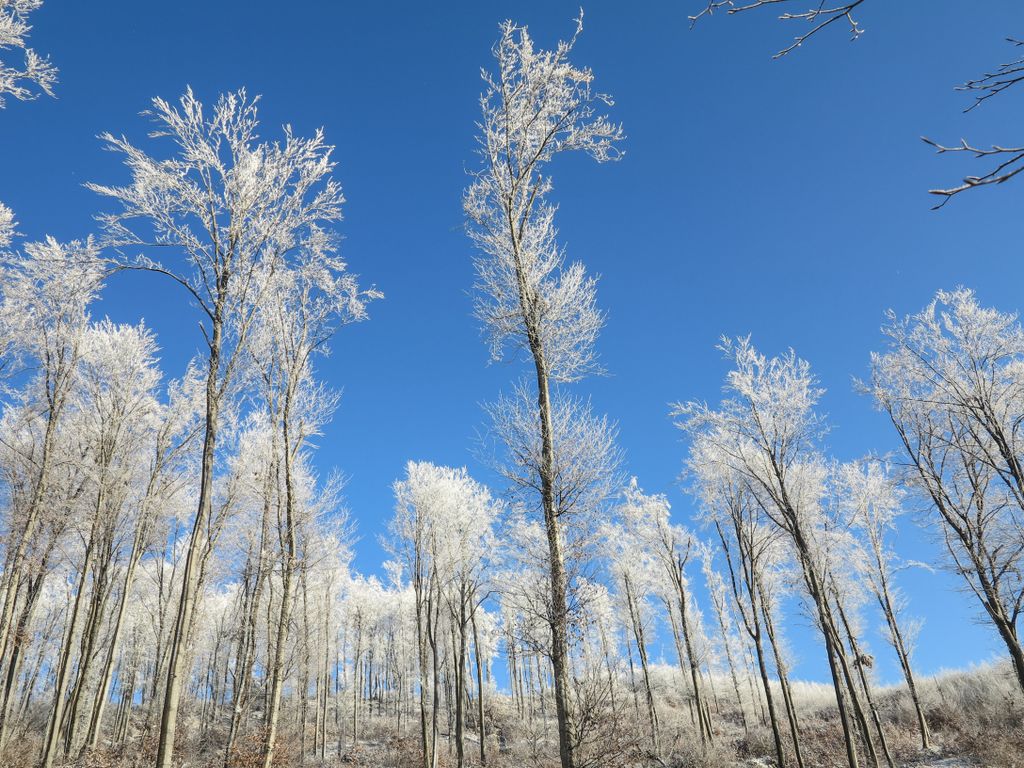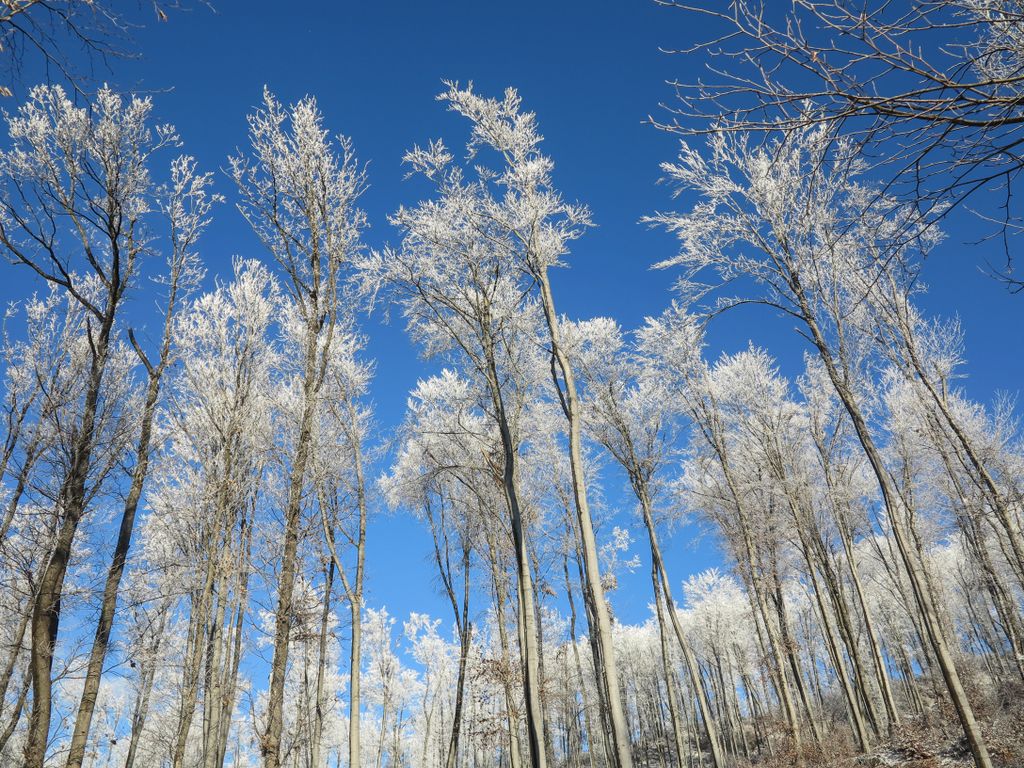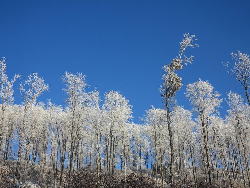 Am ieșit din hățișul pădurii tinere, iar cerul a completat tabloul superb al naturii cu florile de zăpadă care decorau albastrul de deasupra. Flori de zăpadă… așa păreau copacii conturați cu albul înghețat al crengilor, care, în drumul lor către sus, au creat un fel de dans din împletirea albă, artistică a pădurii cu cerul de un albastru intens. Și efectul e cu atât mai puternic cu cât albul acela înghețat nu a acoperit de tot crengile copacilor, ci doar le-a evidențiat și mai tare, iar desenele acelea pe care copacii le-au făcut în albastrul cerului au creat un tablou splendid. De fapt nu un tablou, ci mai multe, toate la vedere în expoziția comună a cerului cu natura, o expoziție care s-a tradus ușor, în câteva cuvinte: ”Cât de frumos, cât de frumos… ”