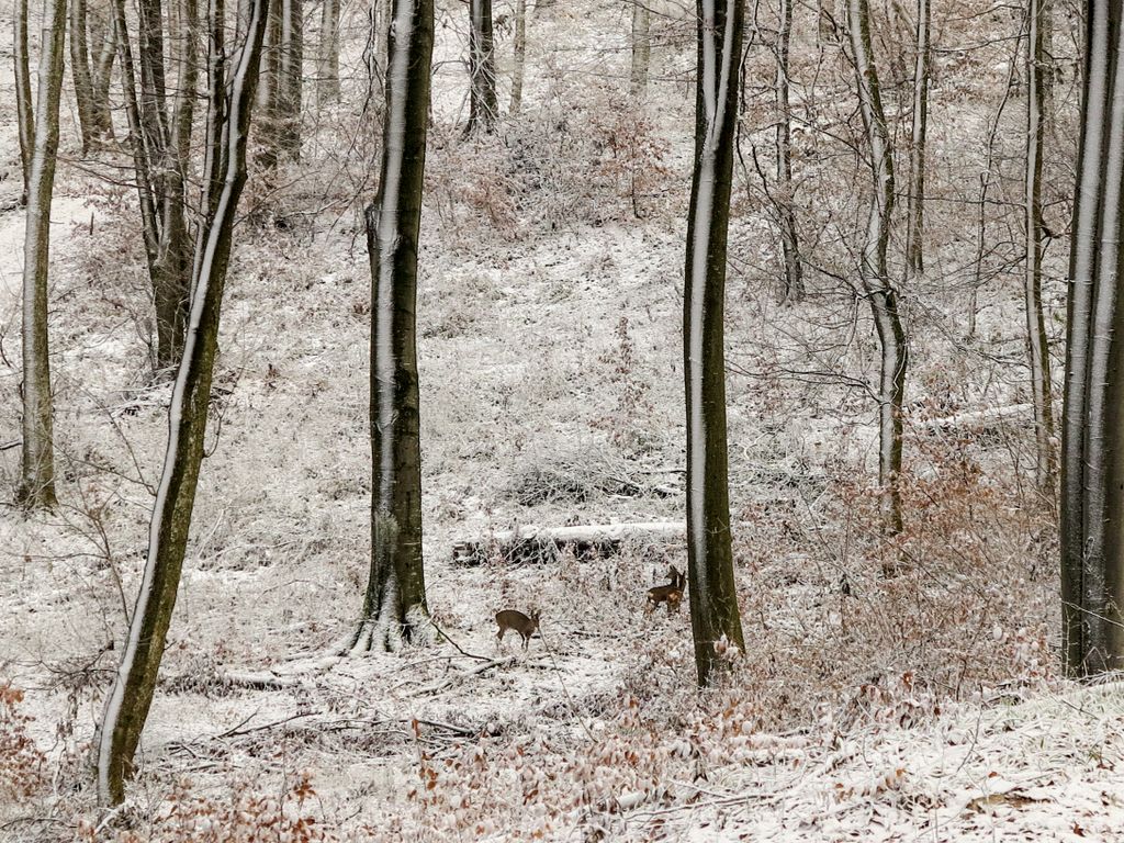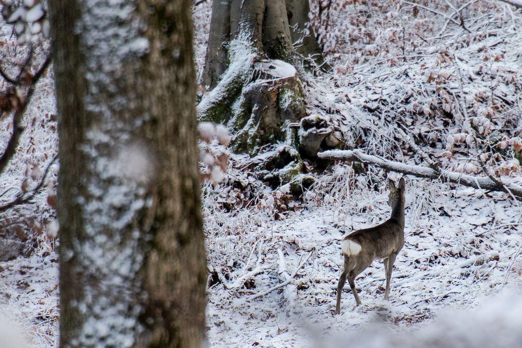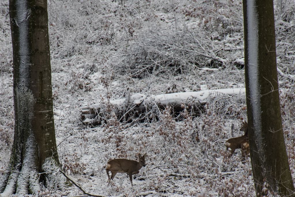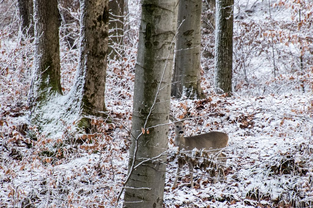 Una dintre cele două căprioare mari, împreună cu puiuțul, au coborât în valea adâncă de lângă ele, iar o căprioară a rămas la vedere, căutând ”străinul” din pădure. Am tăcut, chiar și fotografiile le-am făcut cu o oarecare strângere de inimă, de teamă să nu le tulbur prea tare. Adică, odată ce le vezi ochii ăia mari, blânzi și calzi, siluetele acelea plină de armonia sălbăticiei, alergând prin pădure ca niște unduiri, cum ai putea să le sperii?