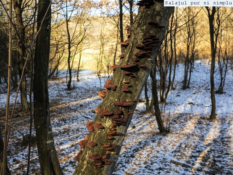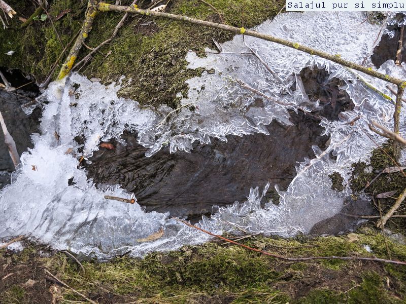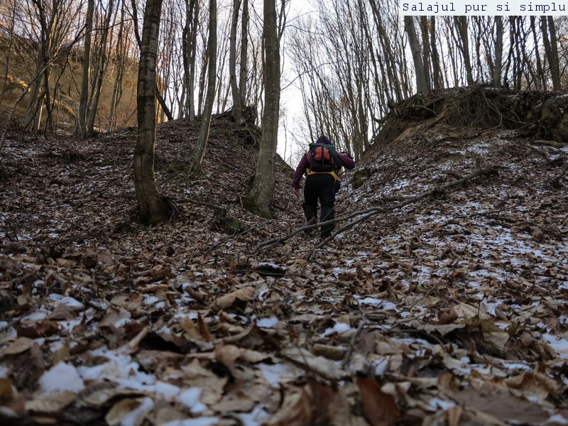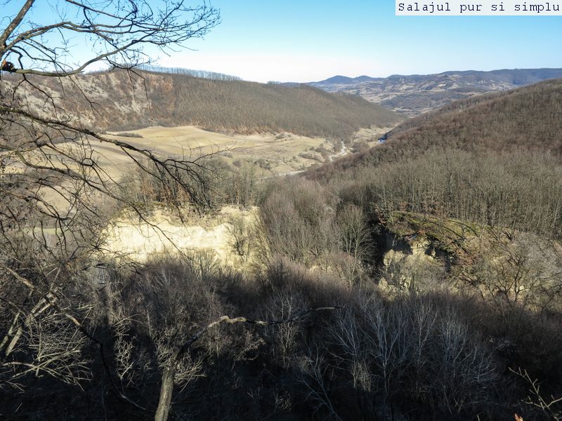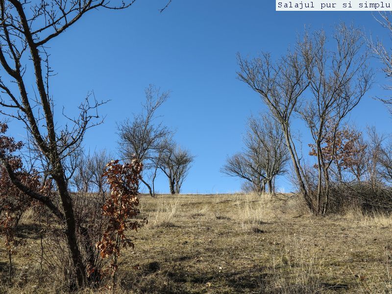 Deși scurt, doar vreo 300 – 400 de metri, urcușul mi-a cam tăiat respirația, dar asta doar pentru că aerul era foarte rece, nu cred să fi fost mai mult de 1 grad, plus că, pământul fiind înghețat bocnă, nimic nu era sigur sub picioare, hăul de sub mine se tot adâncea, iar o căzătură de acolo ar cam fi pus capăt periplului meu prin ținutul vrăjitoarei. Cu atât mai mult, odată ajuns sus, cu cerul senin și soarele strălucind deasupra mea, am făcut o mică pauză, mai ales că priveliștea era deosebită. Liniște, ca și cum nu ar fi existat alt om pe lume în afară de mine, singurul indiciu cum că, dincolo de pădure, existau așezări umane erau dârele albe ale avioanelor cu reacție, care “arau” cerul de deasupra. Și aș fi făcut o pauză mai lungă, acolo, pe pajiștea aia, dar ceva mă atrăgea înapoi, de unde plecasem, nu demult, la cheile galbene din pădure. Însă, cum să plec fără să filmez? Și am scos camera, am așezat-o pe trepied, când vântul a început să sufle cu putere, vânt care a dat de pământ cu trepiedul pe care stătea cocoțată camera.
