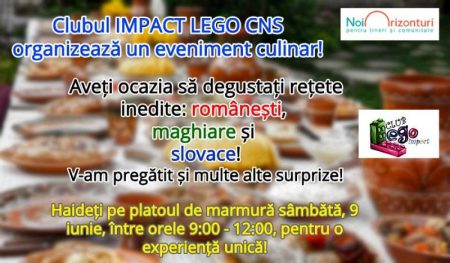 Clubul de voluntariat IMPACT LEGO CNS Zalău organizează sâmbătă, 9 iunie, începând cu ora 9:00, pe Platoul de Marmură din faţa Instituţiei Prefectului, un nou eveniment culinar, care va satisface chiar și cele mai pretențioase gusturi în materie de mâncare.