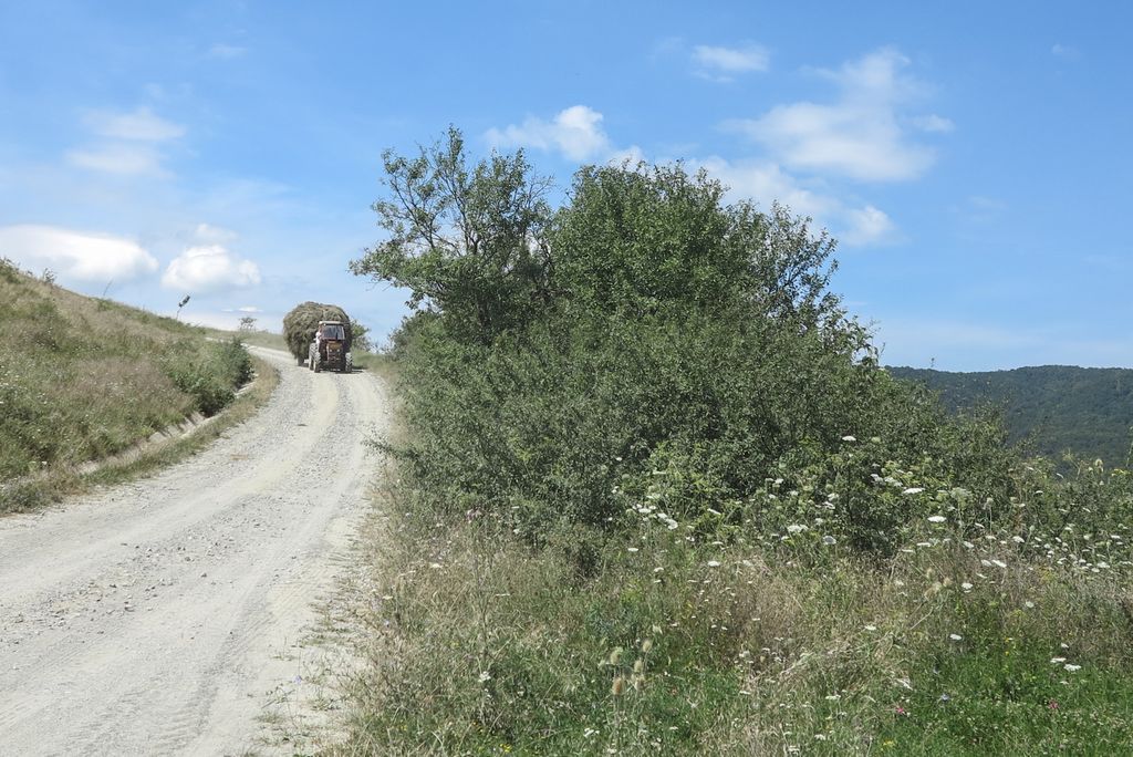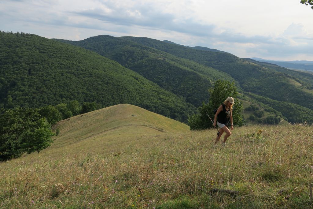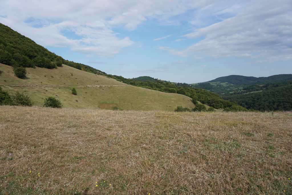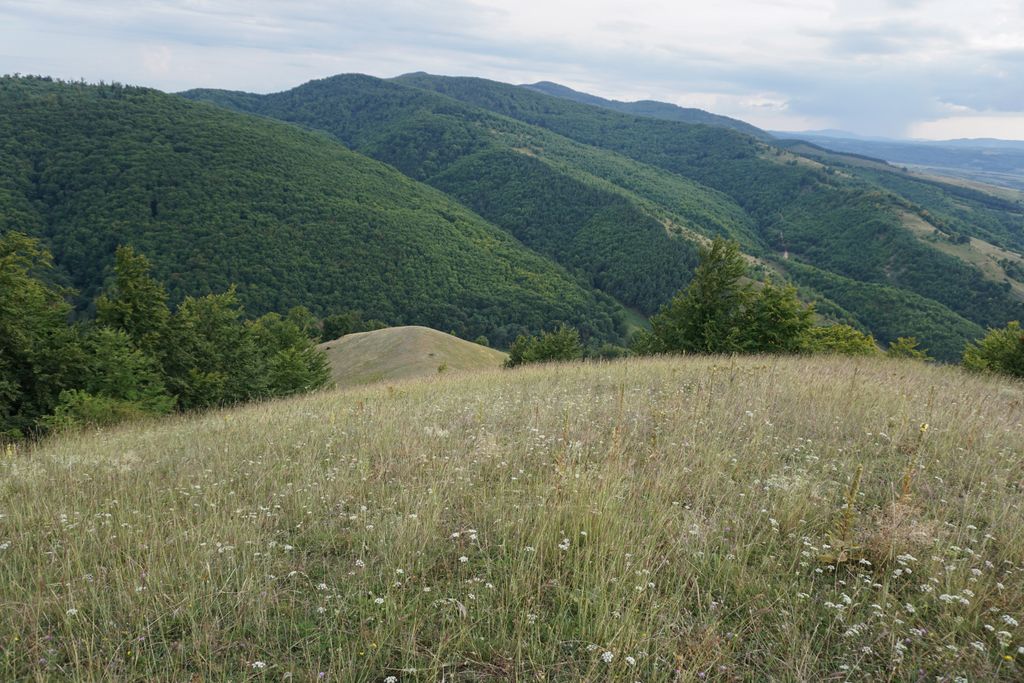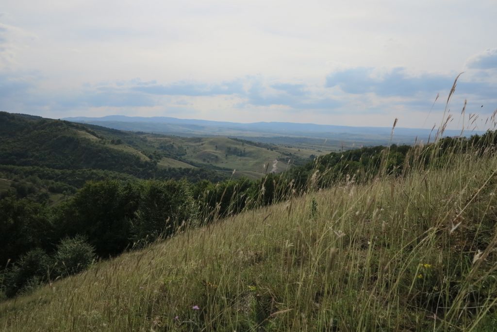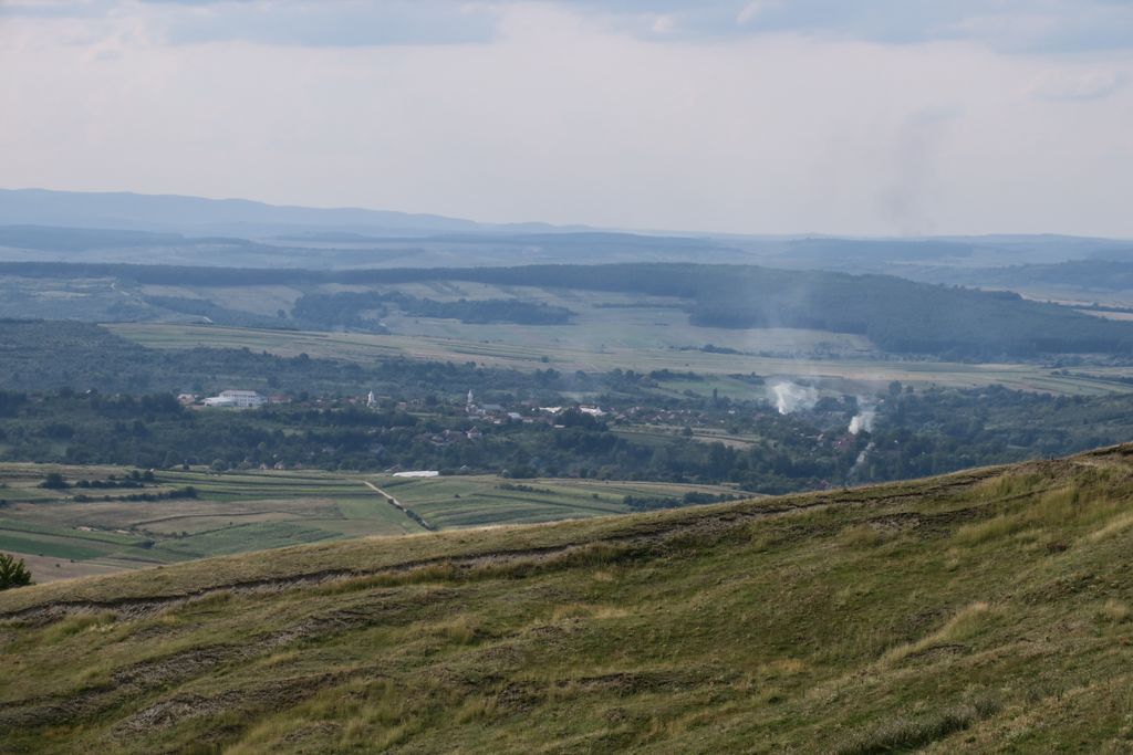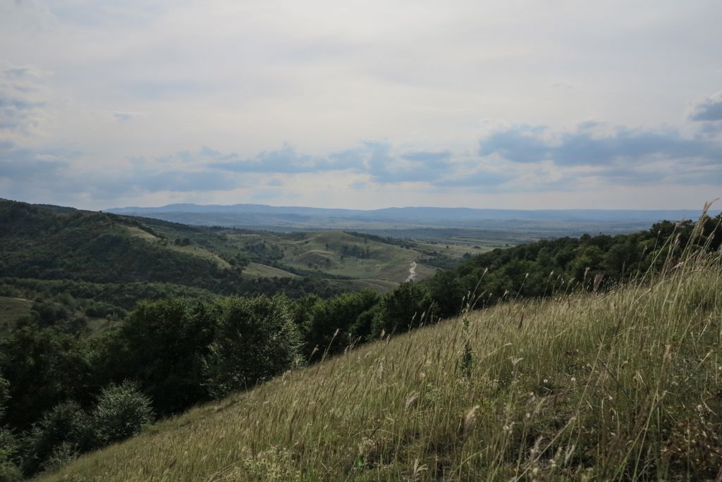 Am crezut că am văzut ce era de văzut, după ce am cutreierat dealurile ăstea aproape o zi întreagă, acum vreo doi ani, așa că, atunci când am luat-o la pas, urcând panta abruptă, nu ne așteptam la cine știe ce, doar o ieșire frumoasă, relaxantă, în natură. Însă, pe măsură ce urcam și priveam în jur, peisajul – și cel din imediata apropiere și cel de hăt-departe – ne-a făcut să ne oprim de multe ori și să exclamăm: ”Ce frumos!”. Iar când am ajuns pe ”vârful de lume” – așa cum am numit, imediat, coama de munte care, așa, proțăpiți în vârful ei, părea că e ditamai vârful de munte, iar efectul pădurilor de pe celălalt versant, chiar din dreptul ochilor noștri, a amplificat și mai tare senzația. Da, nu am urcat foarte mult până acolo, și nici nu e cine știe ce înălțime, însă senzația că ești pe un vârf de lume a fost cât se poate de reală. Mai ales când, la un moment dat, auzind un uliu și căutându-l cu privirea pe cer, l-am văzut zburând undeva sub noi.