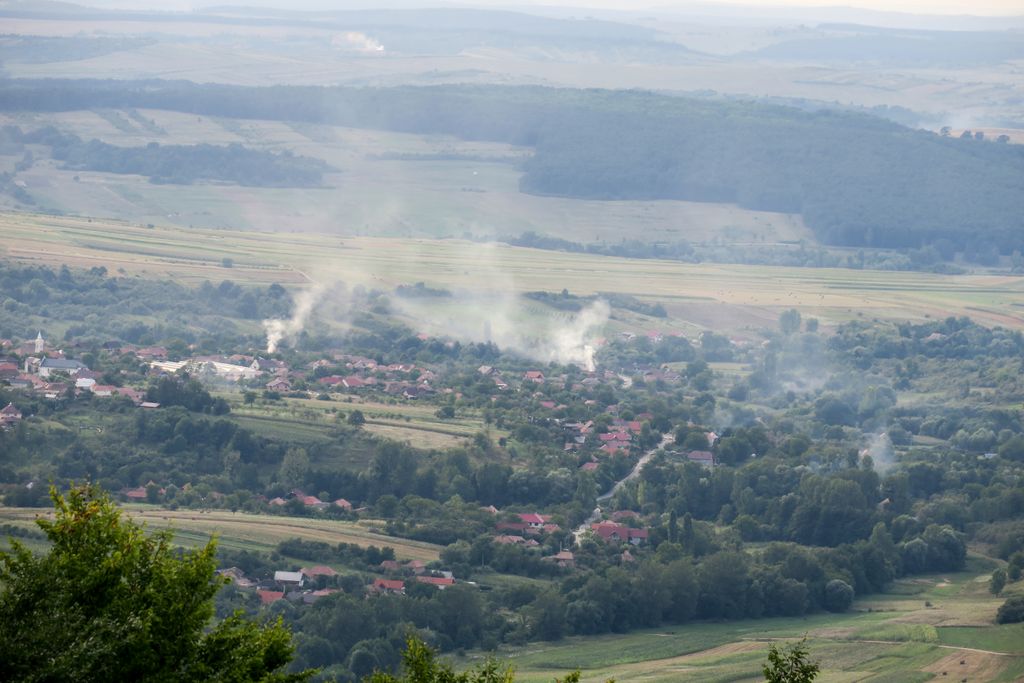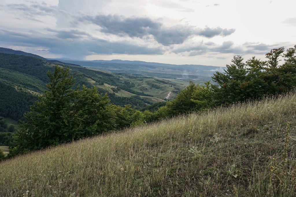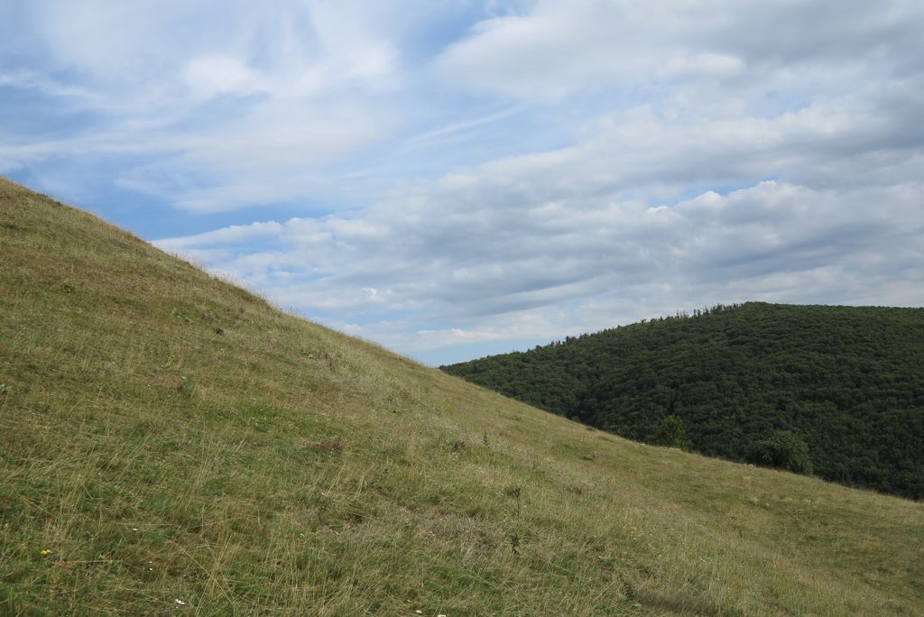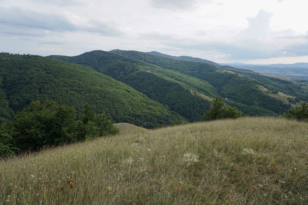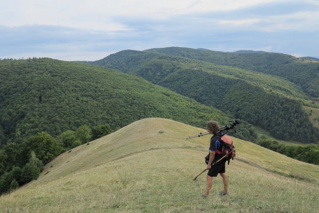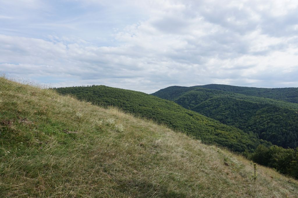 Am crezut că am văzut ce era de văzut, după ce am cutreierat dealurile ăstea aproape o zi întreagă, acum vreo doi ani, așa că, atunci când am luat-o la pas, urcând panta abruptă, nu ne așteptam la cine știe ce, doar o ieșire frumoasă, relaxantă, în natură. Însă, pe măsură ce urcam și priveam în jur, peisajul – și cel din imediata apropiere și cel de hăt-departe – ne-a făcut să ne oprim de multe ori și să exclamăm: ”Ce frumos!”. Iar când am ajuns pe ”vârful de lume” – așa cum am numit, imediat, coama de munte care, așa, proțăpiți în vârful ei, părea că e ditamai vârful de munte, iar efectul pădurilor de pe celălalt versant, chiar din dreptul ochilor noștri, a amplificat și mai tare senzația. Da, nu am urcat foarte mult până acolo, și nici nu e cine știe ce înălțime, însă senzația că ești pe un vârf de lume a fost cât se poate de reală. Mai ales când, la un moment dat, auzind un uliu și căutându-l cu privirea pe cer, l-am văzut zburând undeva sub noi.