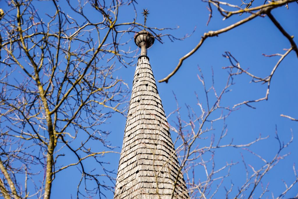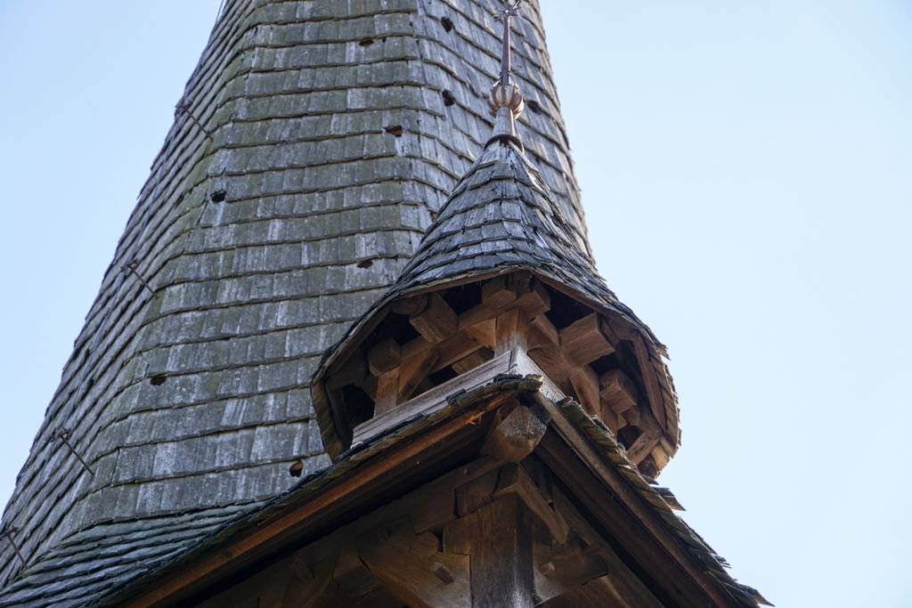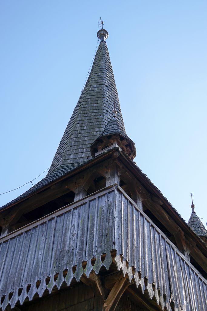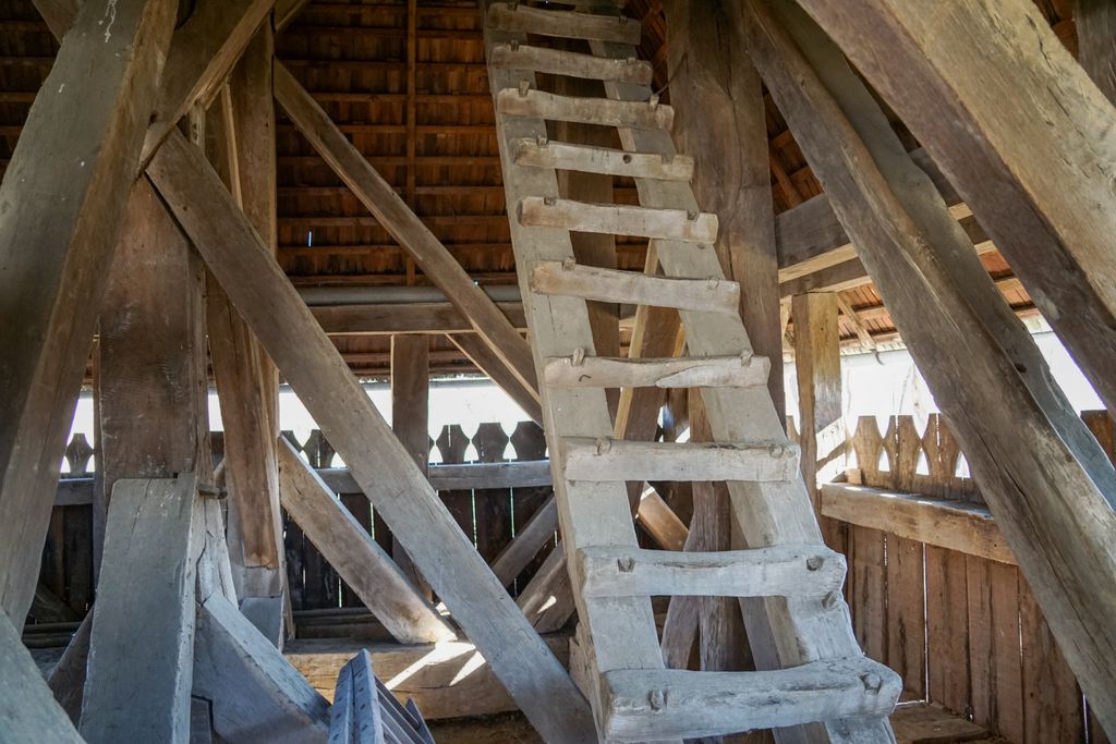 N-am reușit să urcăm în clopotniță, ușa acesteia fiind închisă, așa că ne-am mulțumit cu a-i da ocol, tot privind în sus, către cocoșul din vârful turlei. De ce să fi vrut să urcăm? Pentru că, așa, am fi urcat în ”rachetă”. Ori cel puțin așa îmi imaginam, privind peste gard în interior, acolo unde bârnele groase cât un stat de om sunt ca un fel de platformă de lansare pentru racheta în așteptare. Mai alesc că, aproape de ușă, scara care duce la etaj îți dă un și mai puternic sentiment că te afli lângă o navă. Nu una arhitecturală, ci una reală, gata să pornească într-o aventură.