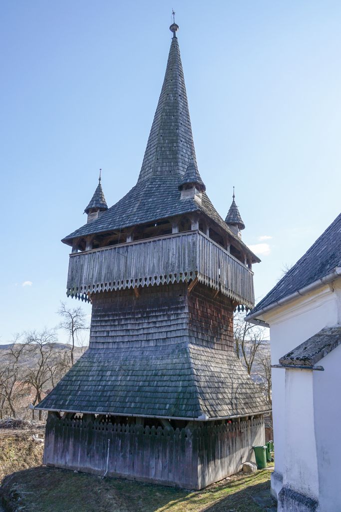 ”Ia, uitați”, ne-a spus o localnică, la poarta căreia ne-am oprit la o poveste, ”ciocănitorile o tot găurit-o. Ele își tot fac treabă p-acolo. D-apoi, îi veche tare clopotnița. Apoi, de ce o fost construită acolo, jos… Pă unde ați venit? Pă strada aceea? No, pă acolo, dacă ați văzut, îs căși crăpate, cum alunecă terenul. Oamenii, săracii, n-o vrut să meargă de la cășile lor. Mai ales bătrânii, săracii. Sînt care și-or stricat de tăt cășile și și-or făcut din nou, mai în sus.”
