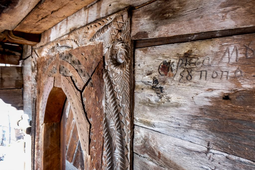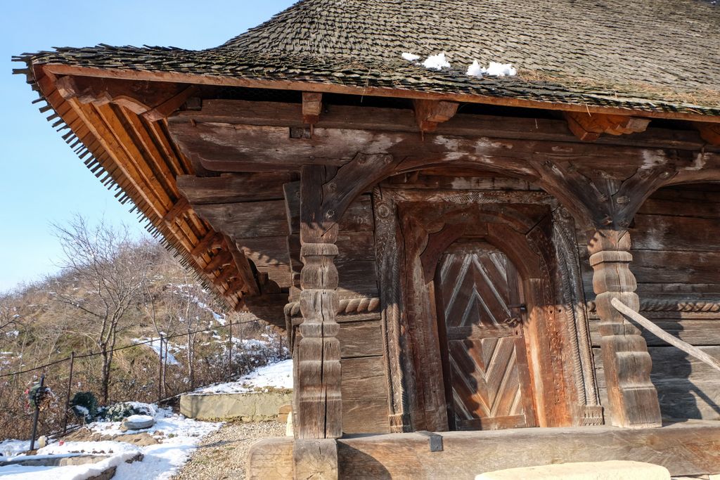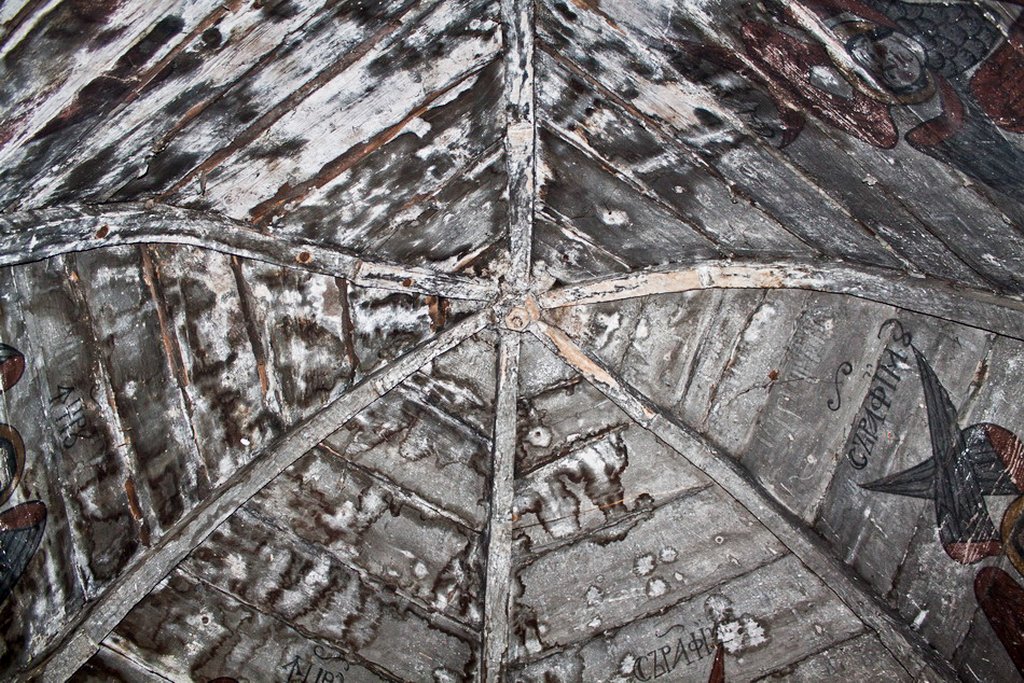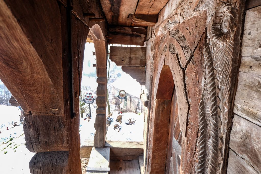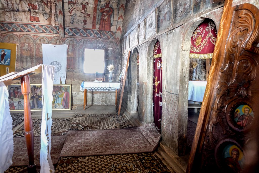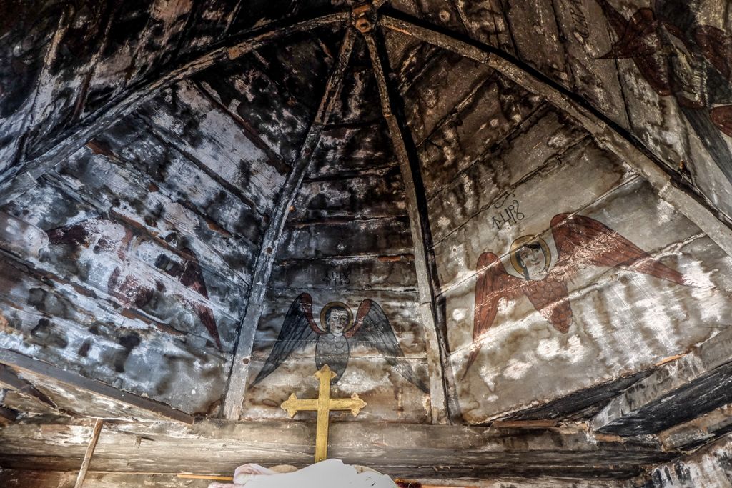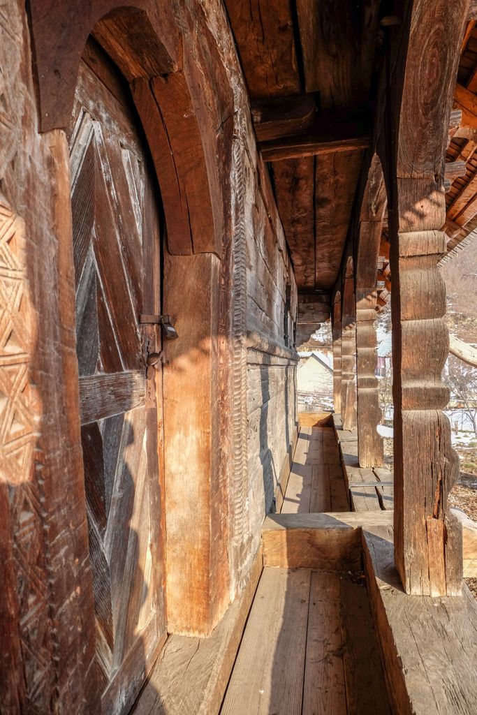 Și imaginea asta mi-a rămas întipărită pe retină, în minte, în suflet, și degeaba aș mai fi încercat să îmi mut atenția înspre altceva, ar fi fost de prisos. Lucrătura deosebită a bisericii, atât a exteriorului, mai ales ușa bisericii, al cărei cadru e foarte frumos sculptat și împodobit cu niște brâuri în relief, cât și a interiorului ar fi meritat să zăbovesc mai mult acolo, cu gândul și privirea. Pridvorul, care se întinde pe toată lungimea pronaosului și naosului, e constituit dintr-o succesiune de cinci stâlpi, frumos decorați, între care se intercalează arcade formate de contrafișele pridvorului, cuie de lemn cu capete decorative legând contrafișele de stâlpi. Și, pe lângă toate astea, picturile, atribuite zugravului Nichita, sînt altfel decât la celelalte biserici, bine păstrate și variate. Însă zâmbetul acela liniștitor al îngerilor și serafimilor…