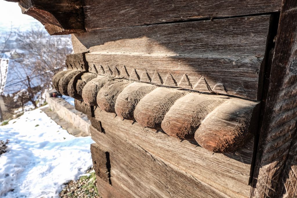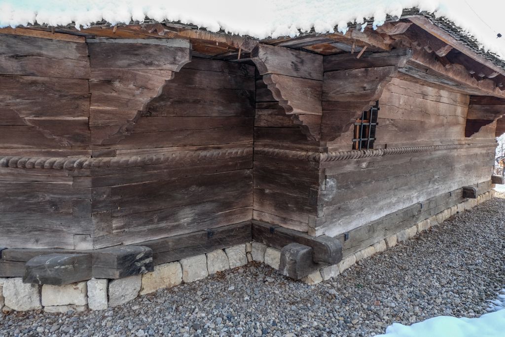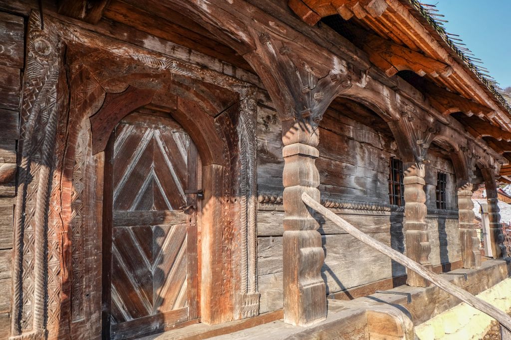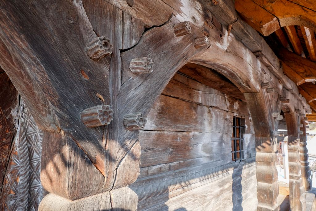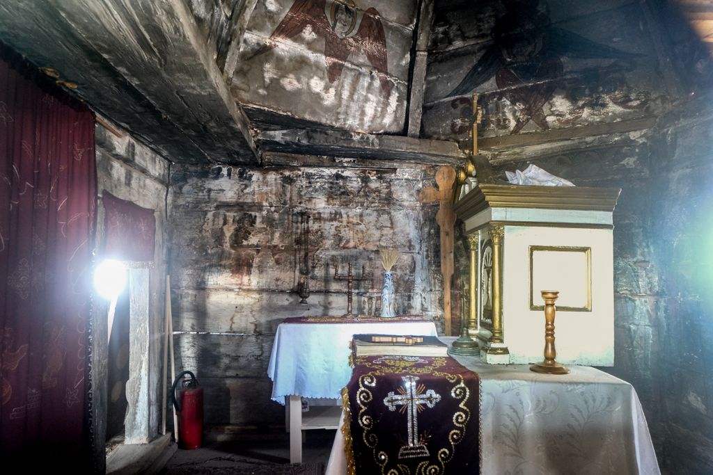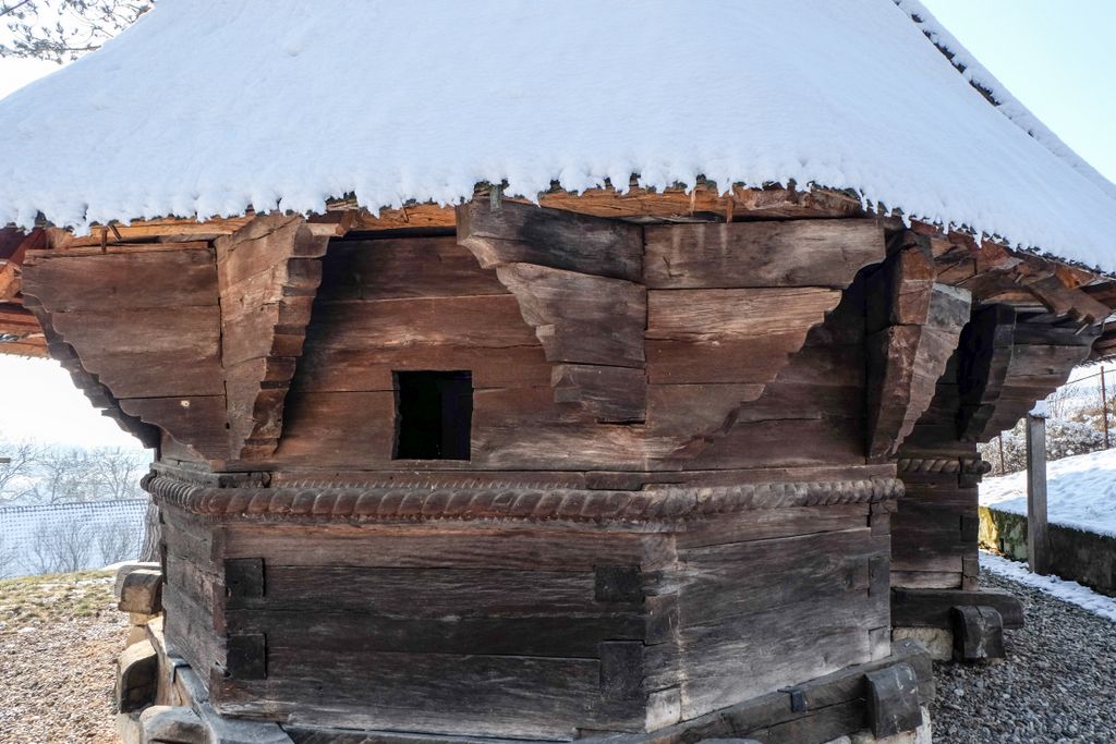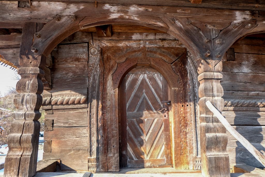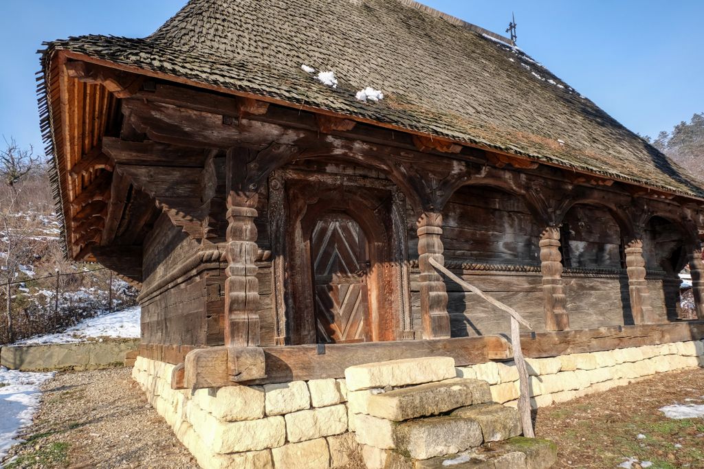 Și imaginea asta mi-a rămas întipărită pe retină, în minte, în suflet, și degeaba aș mai fi încercat să îmi mut atenția înspre altceva, ar fi fost de prisos. Lucrătura deosebită a bisericii, atât a exteriorului, mai ales ușa bisericii, al cărei cadru e foarte frumos sculptat și împodobit cu niște brâuri în relief, cât și a interiorului ar fi meritat să zăbovesc mai mult acolo, cu gândul și privirea. Pridvorul, care se întinde pe toată lungimea pronaosului și naosului, e constituit dintr-o succesiune de cinci stâlpi, frumos decorați, între care se intercalează arcade formate de contrafișele pridvorului, cuie de lemn cu capete decorative legând contrafișele de stâlpi. Și, pe lângă toate astea, picturile, atribuite zugravului Nichita, sînt altfel decât la celelalte biserici, bine păstrate și variate. Însă zâmbetul acela liniștitor al îngerilor și serafimilor…