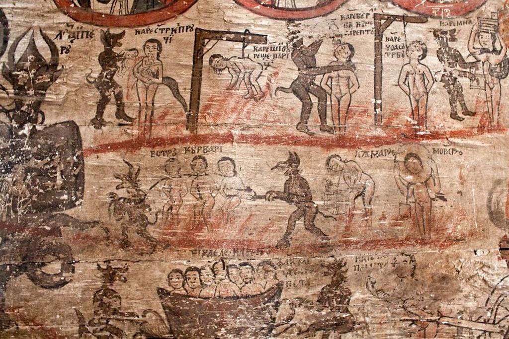 Apoi, ca o contrapondere la lumină, tot privind pereții interiori, am văzut pictura asta, cea care, așa cum am aflat citind despre istoria bisericuței, înfățișează judecata de apoi. Acuma, scenele care reprezintă un personaj – ”Răul” -, care îi chinuie pe oamenii ajunși la mila lui, au reușit, oarecum, să mă facă să uit zâmbetele pe care le-am descoperit deasupra altarul. Da, pentru a ține în frâu răutatea nativă a omului s-a inventat chestia asta (ori poate chiar există), cu Judecata de apoi, unde, dacă în viața asta nu ai trăit conform învățăturilor bisericești, o să ajungi în Iad. Însă asta nu face decât să confirme că frica de pedeapsa divină e ceea ce îl ține pe om pe linia de plutire, nu partea frumoasă. Iar asta nu sună deloc bine, ba chiar refuz să cred așa ceva.