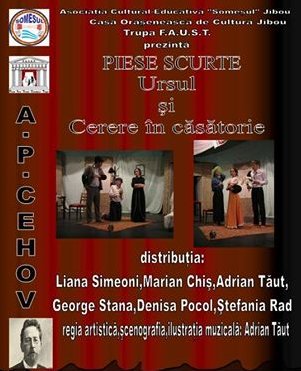 Asociaţia Cultural Educativă „Someşul“ Jibou şi Trupa F.A.U.S.T invită jibouanii, şi nu numai, să participle la premiera spectacolului Piese Scurte – „Ursul“ şi „Cerere în Căsătorie“ de A.P.Cehov. Evenimentul va avea loc în 26 septembrie, în sala mare a Casei de Cultură Jibou. Distribuţia: Liana Simeoni, Marian Chiş, Adrian Tăut, George Stana, Denisa Pocol, Ştefania Rad. Regia artistică, scenografia şi ilustraţia muzicală: Adrian Tăut.