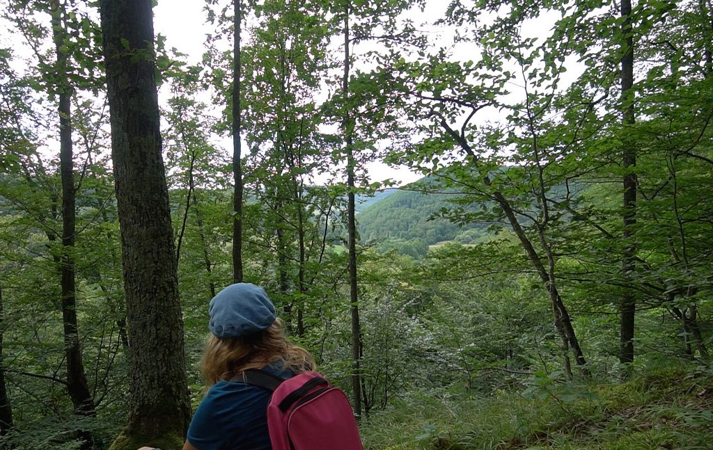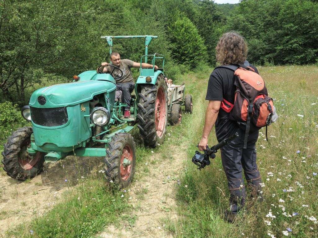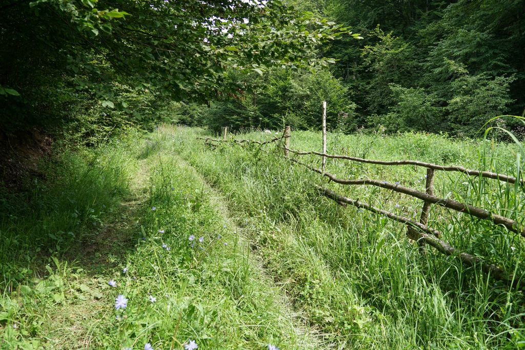 – Așe. După ce mereți pă rât în sus, nu de tot, până pe la jumate (în sfârșit am înțeles și noi despre care jumătate era vorba să o urcăm). Apoi iți videa o urmă de jip. No, mereți pă urmă, până cătă niște nuci. Acole până unde să vedie că întoarce jipu’. No, de acole, mereți la dreapta. Iți videa voi, că să văd stanele în pădure.