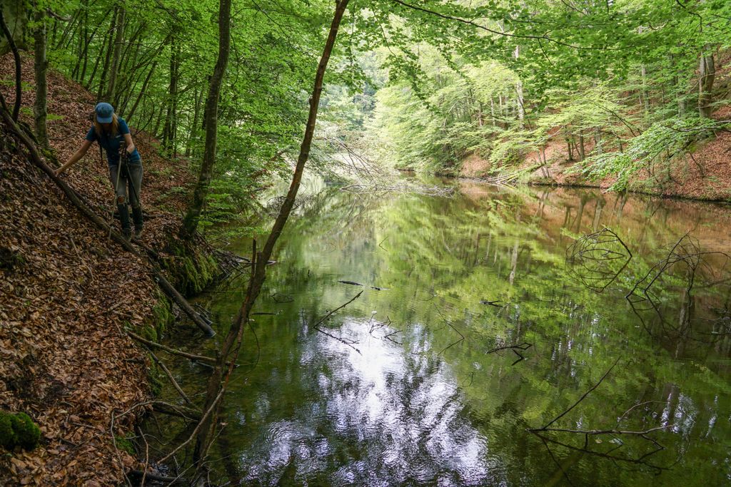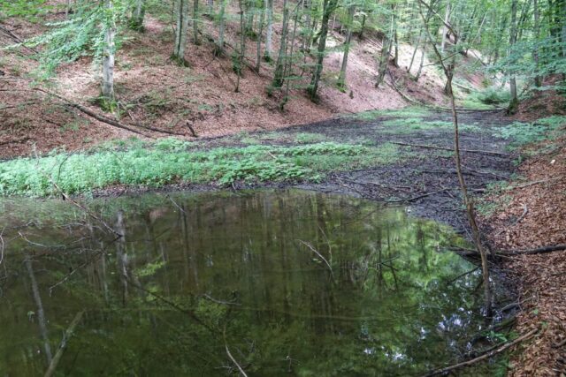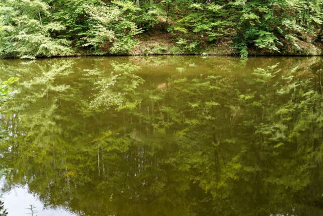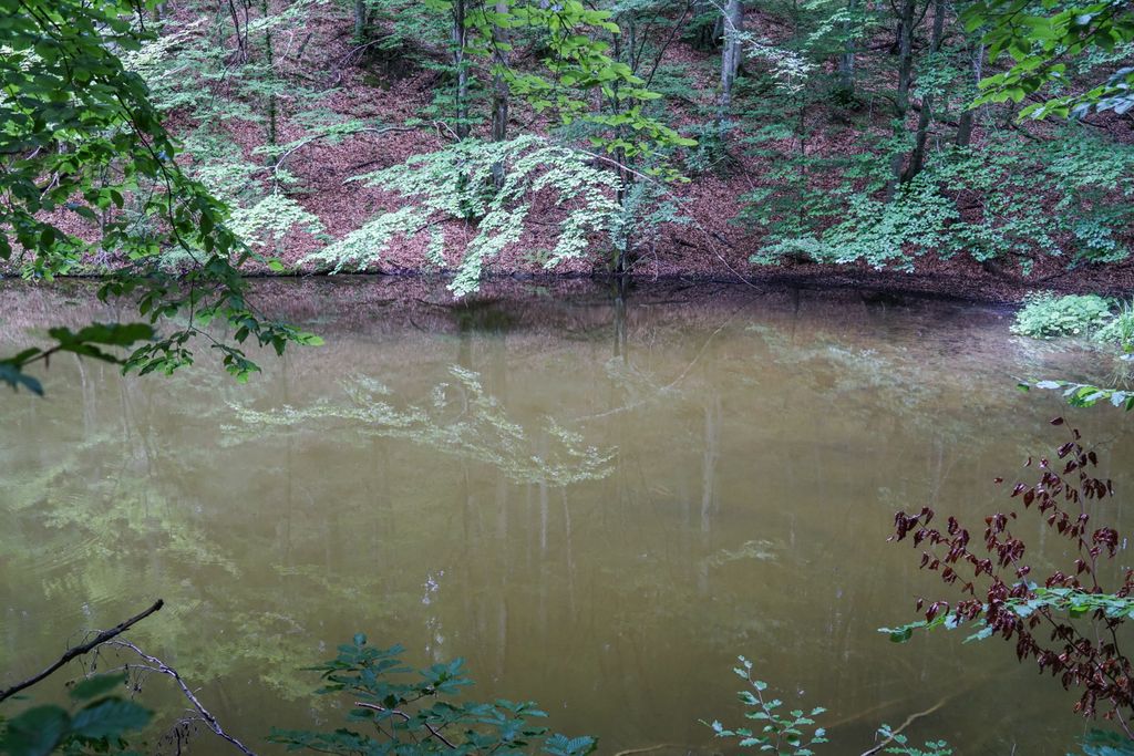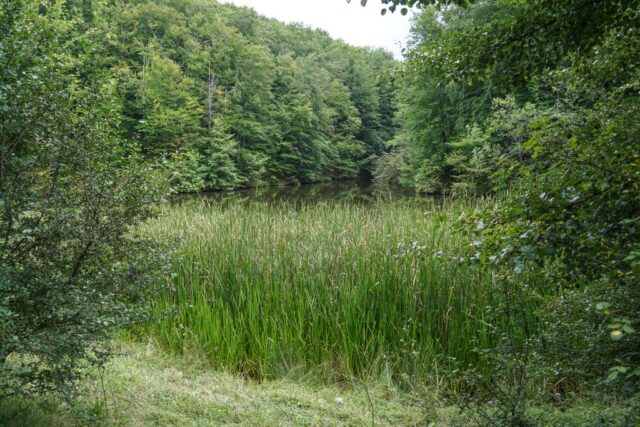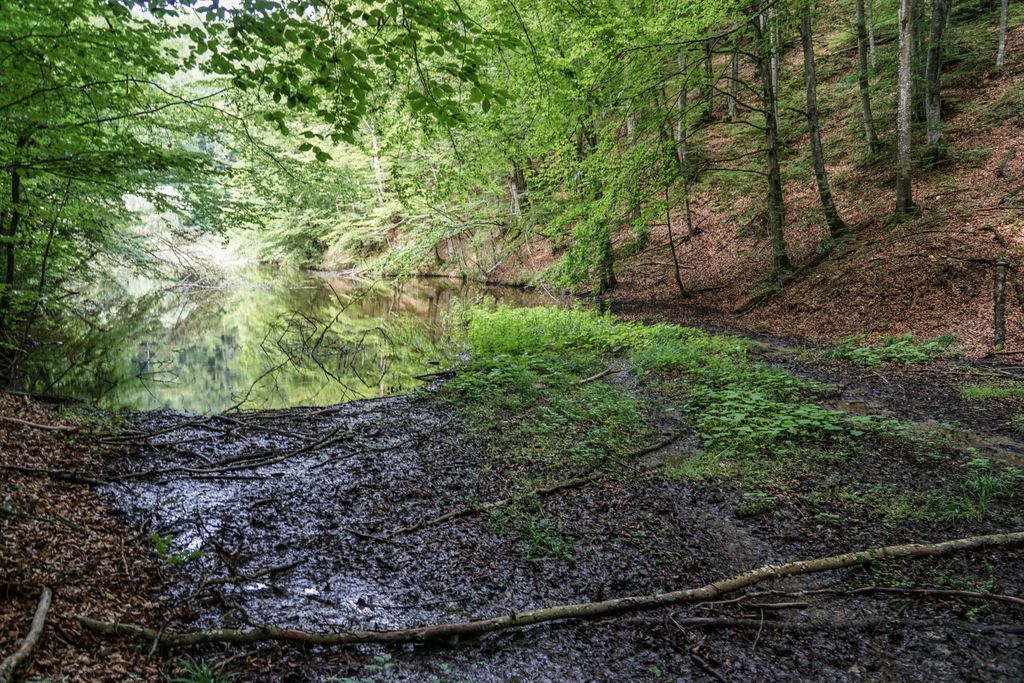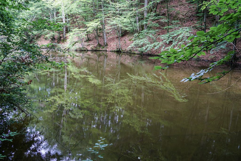 Am ajuns la lac trecând prin pădure, prin și pe lângă vegetația luxuriantă de-a dreptul, umiditatea din aer fiind una foarte ridicată, cu un efectul puternic de saună, totul fiind umed în jur: pe jos, pe iarbă, pe frunzele copacilor, pământul mustind de apă. Prima dată am văzut barajul, pe cei trei bărbați (doi erau cei pe care i-am întâlnit la trecerea văii), care pescuiau, și un cățel venit și el cu oamenii la lac. Apoi am dat cu ochii de lac.