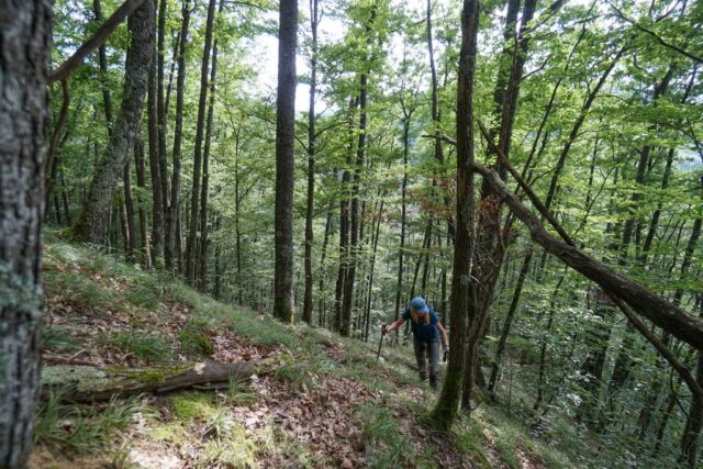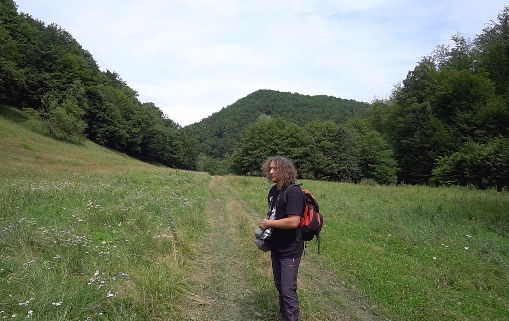 Doar ne-am zis că urcăm de-a dreptul. Ne-am întors când ne-am dat seama că suntem chiar pe stană, care devenea aproape ca un perete de 90 de grade mai în sus, iar cățăratul peste mușchi și smocurile alunecoase de iarbă era mult prea periculos, mai ales că eram încărcați cu toată aparatura, lucru care a făcut să fie totul și mai dificil. Am ales altă rută, pe lângă stană, pe un versant care deși nu părea foarte abrupt, devenea tot mai vertical pe măsură ce urcam, de am ajuns să umblăm în patru labe, atât de tare ne venea panta în piept. Da, am făcut și pauze, aerul cu o umiditate foarte mare fiind foarte greu de respirat, iar noi transpiram la greu, lucru care a atras toate insectele pădurii asupra noastră. M-au mușcat țânțati uriași, muște colorate, insecte cu dungi alb-negru, cu dungi galben-negru, cu picățele, ba chiar și tăuni din aceia care au treabă, de obicei, cu vacile și boii. Și chiar m-am întrebat: ”Mă, insectele ăstea mă văd, cumva, ca pe un bou? Că altfel de ce să-și bage trompa în pielea mea de să-mi de-a sângele instant?”