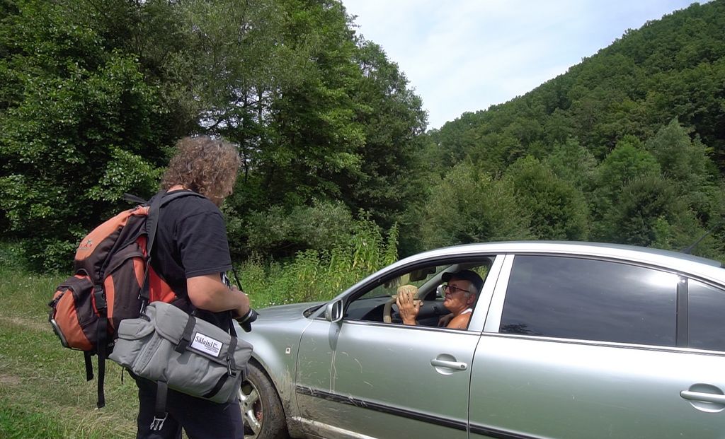 Am făcut cale întoarsă doar pentru voiam să ajungem la lac, altfel am fi mers mai departe, în adâncul naturii, când, de nicăieri, auzim zgomot de motor. Apoi, legănându-se încet peste gropile din drum, ca o barcă dusă de valuri, a apărut o mașină, în care erau doi bărbați ceva mai în vârstă. Le-am făcut semn să oprească.