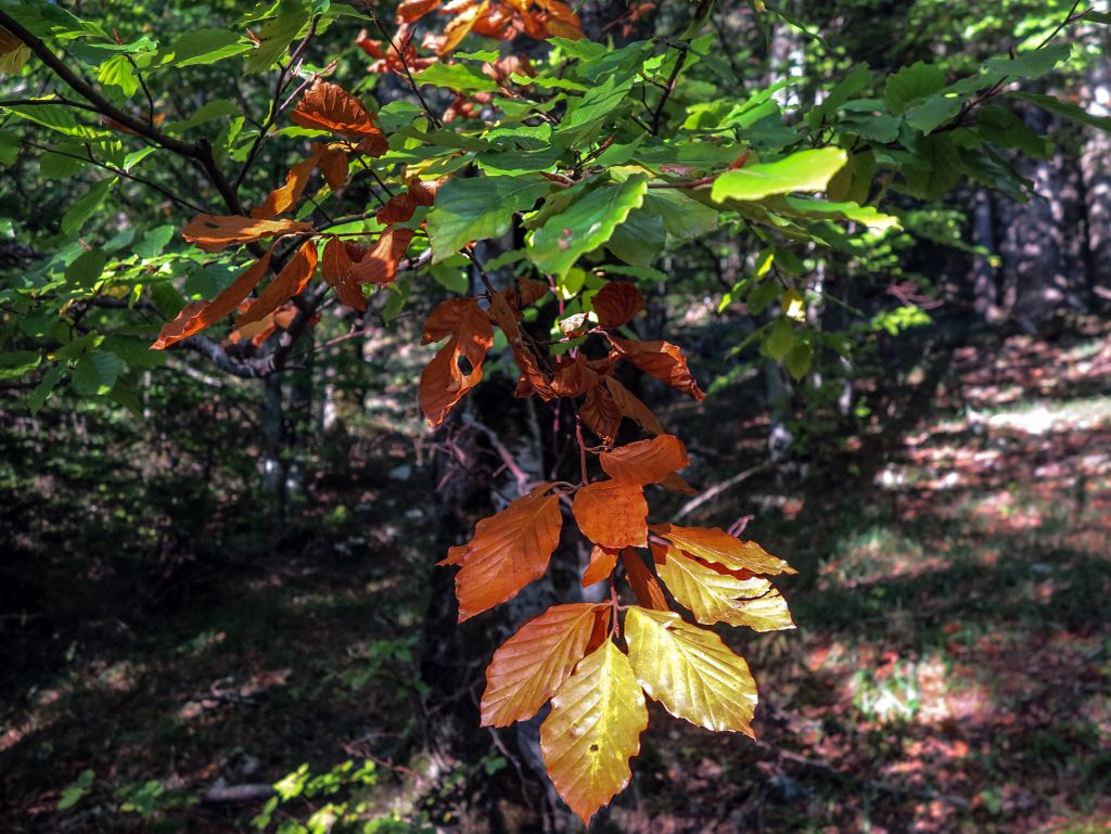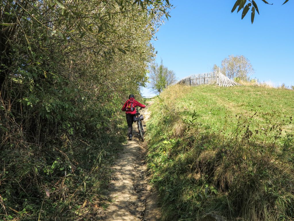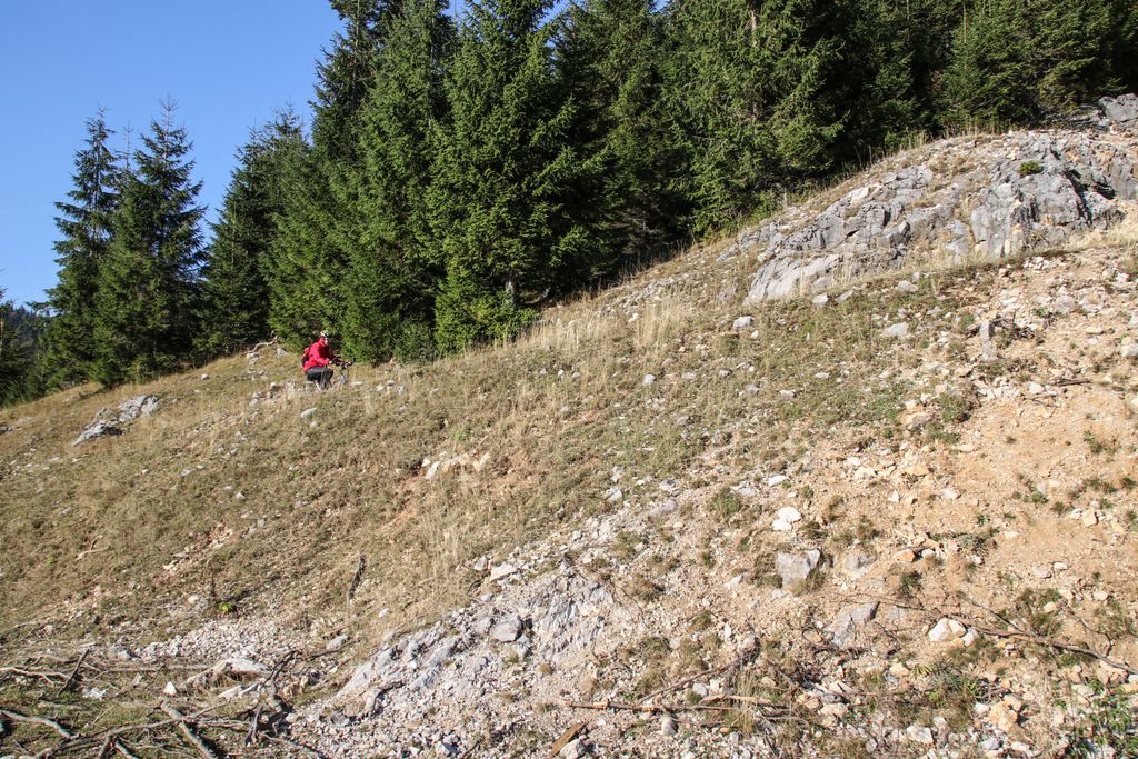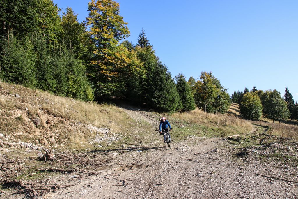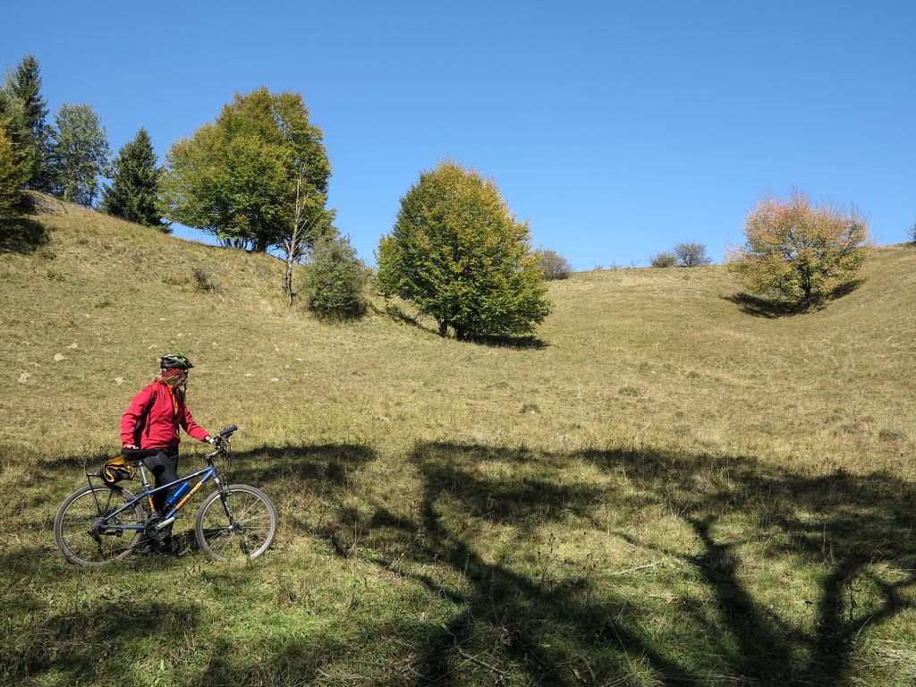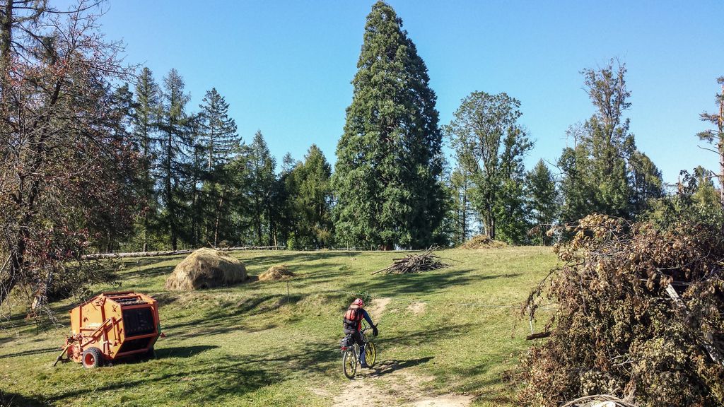 Am lăsat drumul forestier și am împins bicicletele pe cărare, chiar dacă să pedalăm ar fi fost mai ușor, dar am preferat frumosul, și după câteva zeci de metri, am ajuns, din nou, la drum. Acuma, la stânga, la dreapta? L-am întrebat pe singurul om întâlnit pe unde s-o luăm, iar el ne-a spus ce și cum. Adică, de unde eram, la dreapta, către vârf. Am luat-o la dreapta, către vârf, și am tot pedalat mai departe, până când drumul a părut mai mult o vale care ducea fix către o stână sau un staul (cine să mai stea să vadă despre ce e vorba), acolo unde niște câini cât niște viței, simțindu-ne, și-au trimis lătratul pe post de buzdugan. Ne-am oprit, nu de teamă, niciodată câinii, așa cum am mai spus-o, nu au avut câștig de cauză în nicio încăierare, ci pentru că drumul se oprea… nicăieri. Nici urmă de vreun arbore uriaș.