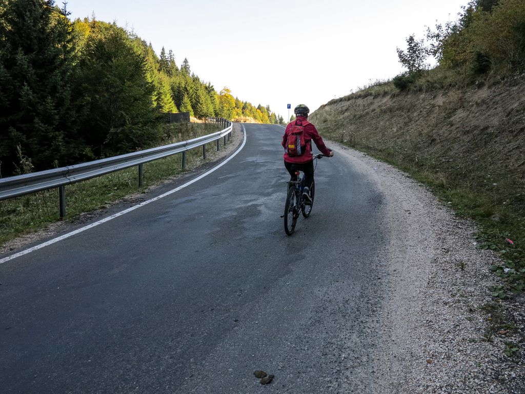 Odată cu seara, a venit și frigul, iar coborârea s-a dovedit a fi mult mai dificilă decât crezusem, iar asta pentru că degetele ne-au înghețat pe manetele frânelor, și atunci când ne-am oprit, să ne dezmorțim, odată cu sângele care a dat năvală în degete, a apărut și durerea. Ce bune ar fi fost niște mănuși! Pe de altă parte, parcă prefer durerea provocată de îngheț, decât să mă afișez în tot felul de echipamente pentru ciclism, un marketing agresiv, de altfel, care a pus o pată urâtă peste ceea ce înseamnă ciclism, a merge cu bicicleta însemnând, tot mai mult, a te afișa cu costume sclipitoare, mănuși de firmă, cască de multe sute de lei, pantofi nu știu de care, reglabili, de sute de euro, ciclocomputere care afișează pe net pe unde și cât de repede ai pedalat. De parcă asta ar conta. Bicicleta înseamnă libertate. Chiar și aceea care îți îngheață degetele mâinilor pe ghidon.